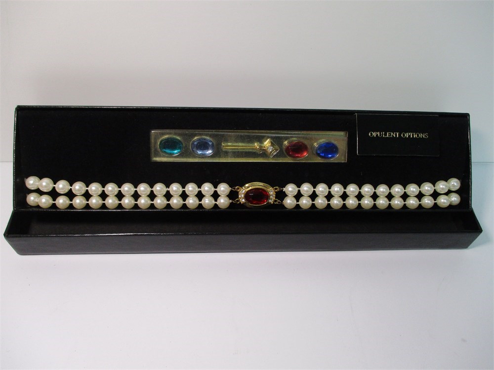 This is a Vintage Revlon "Opulent Options".  It is a 30" Double Strand of Faux Pearls With Interchangeable Imitation Gen Stone Clasp. It is in its original box and unused!  Wonderful condition!  Made in Japan.