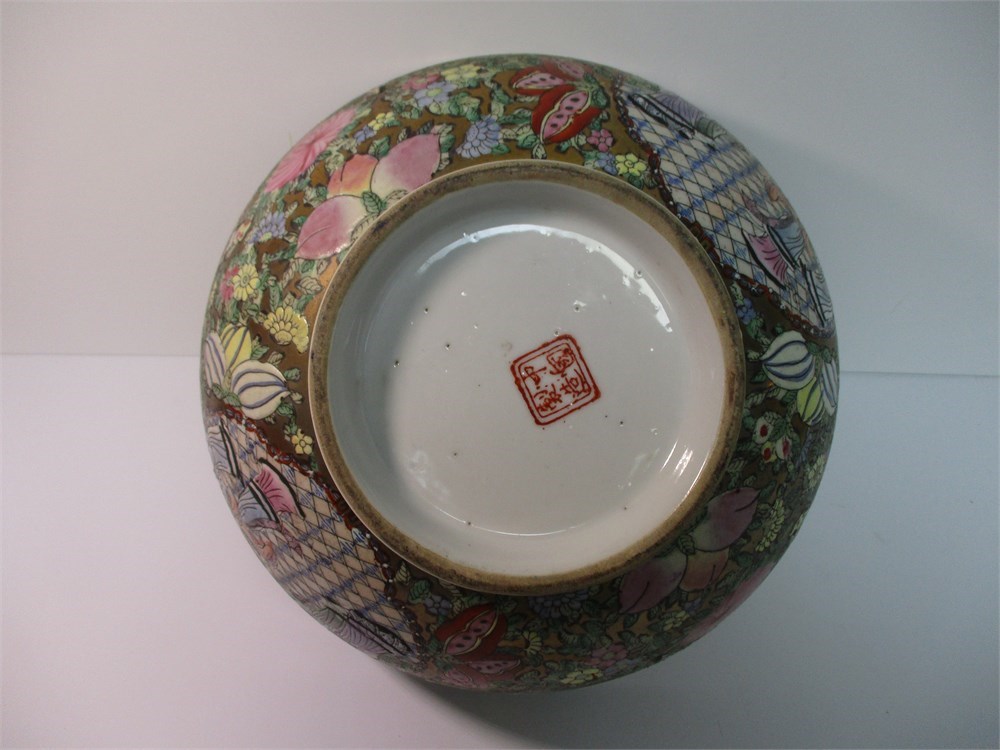 This is a Beautiful Vintage, Chinese, Famille Rose Bowl.  This classic style has lovely details throughout along with gold accents with rich color variations.  Bowl has a 1/2" raised base and measures 12" across and stands 5.5" tall.   No visible signs of damage.  It is marked on the bottom.