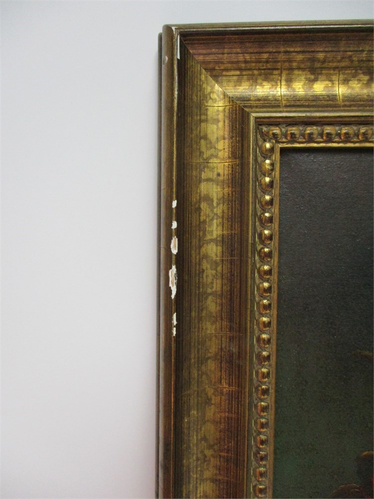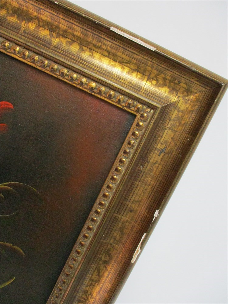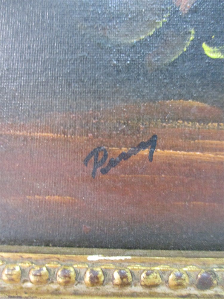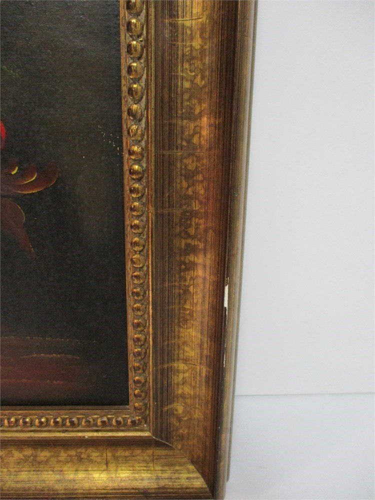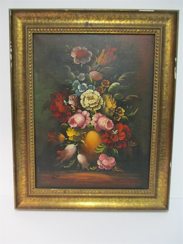 This is a lovely, vintage, still life, oil on canvas of a floral bouquet.  The painting exhibits a vivid arrangement of flowers, roses, tulips, chrysanthemums and peonies with rich layered tones against a dark background.  Inspired by 17th -18th century Dutch and Flemish paintings.  It is framed in a ornate gold tone wood composite frame mildly distressed. It is signed but not legible.  The frame as some wear to the edges.  Measures 17 x 21"