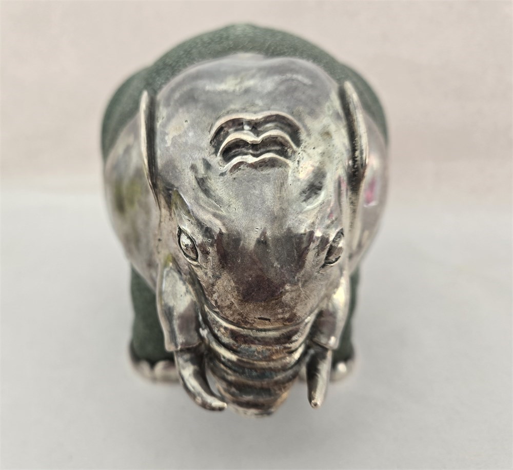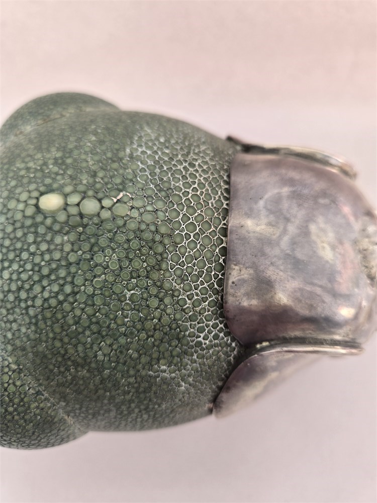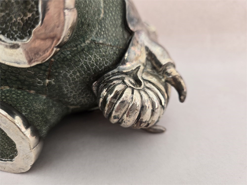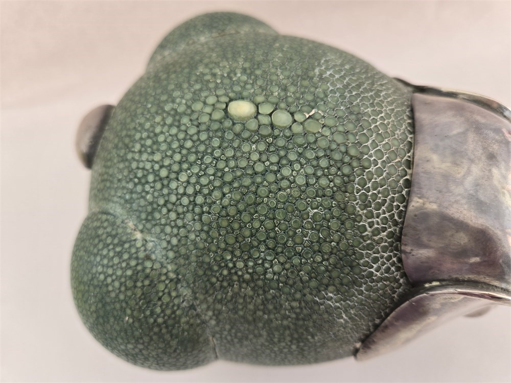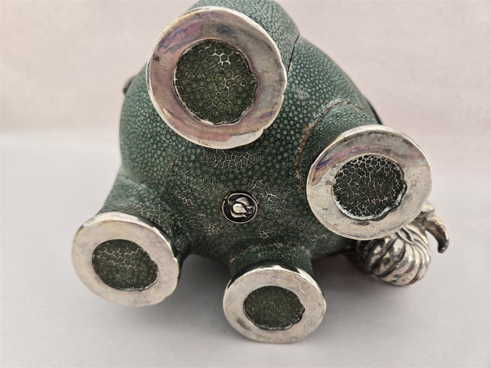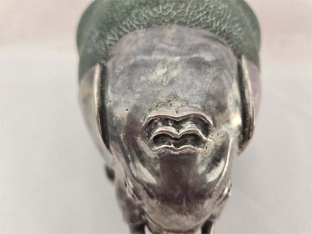 Lotus Arts de Vivre Shagreen and Silver Elephant Sculpture, Thailand, 20th Century. A distinctive and finely crafted figure featuring a green shagreen body with sterling silver ears, feet, and facial elements, showcasing a unique blend of exotic materials and expert craftsmanship. The underside is marked with the Lotus Arts de Vivre emblem.