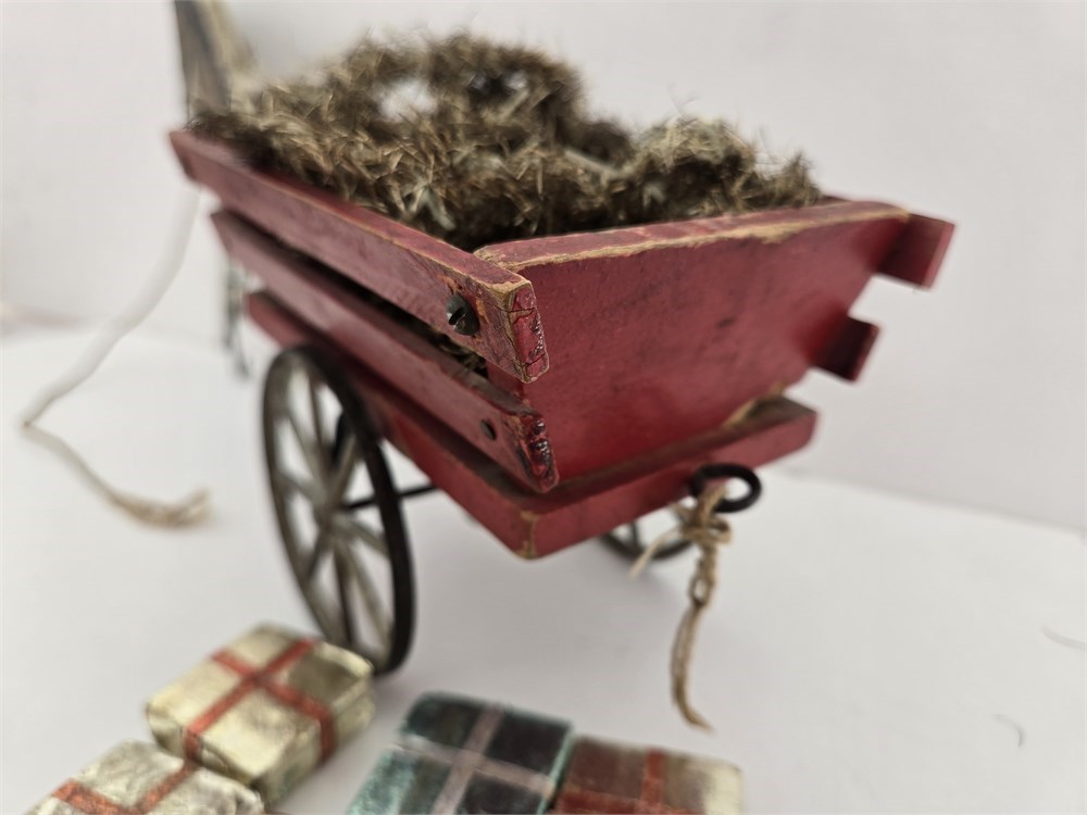 The lithographed horse retains strong color with age-appropriate surface wear and cracking typical of paper-over-wood toys of this era. The tin legs show expected oxidation but remain firmly attached. The red wooden wagon shows original paint with charming patina. Presents appear to be period wrapped foil and paper boxes, adding authenticity and character.