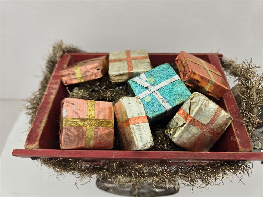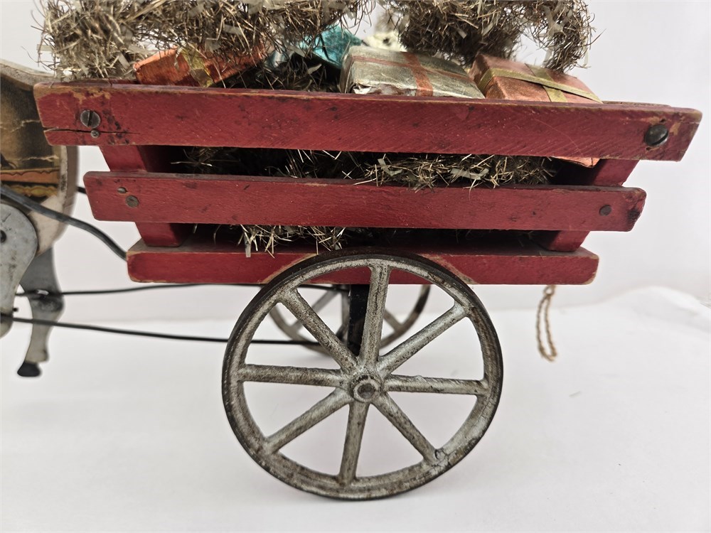 Early 1900s Horse-Drawn Christmas Wagon Pull Toy – Lithographed Horse, Tin Legs, Red Wooden Cart, Tinsel Trim & Original Wrapped Gifts