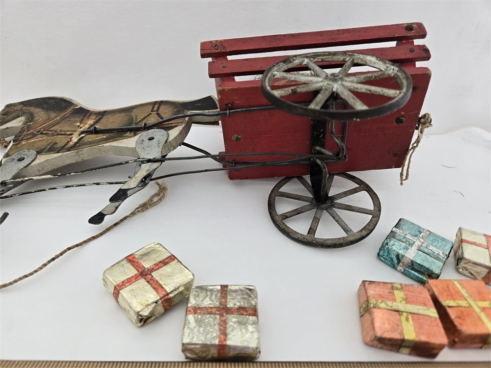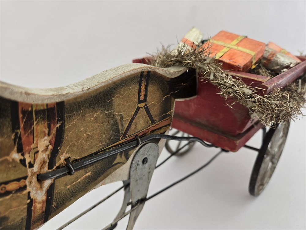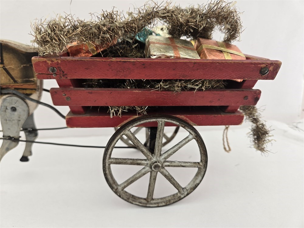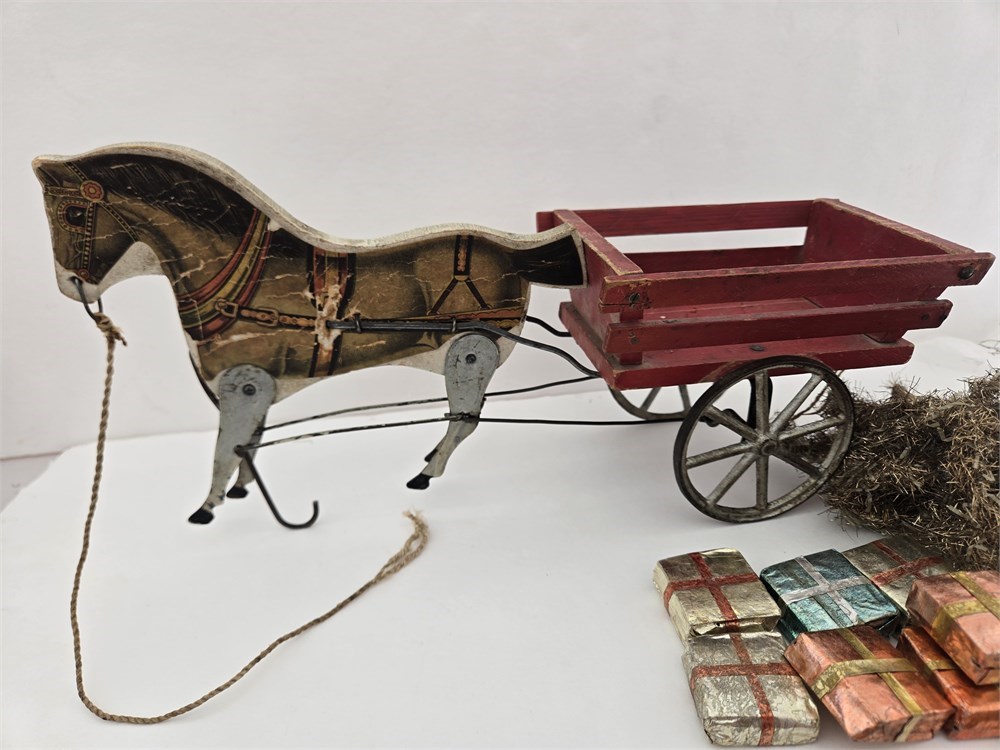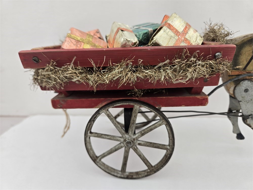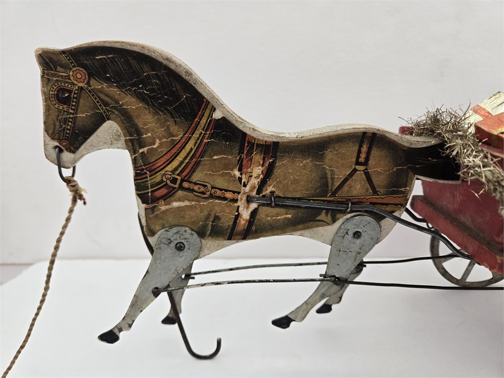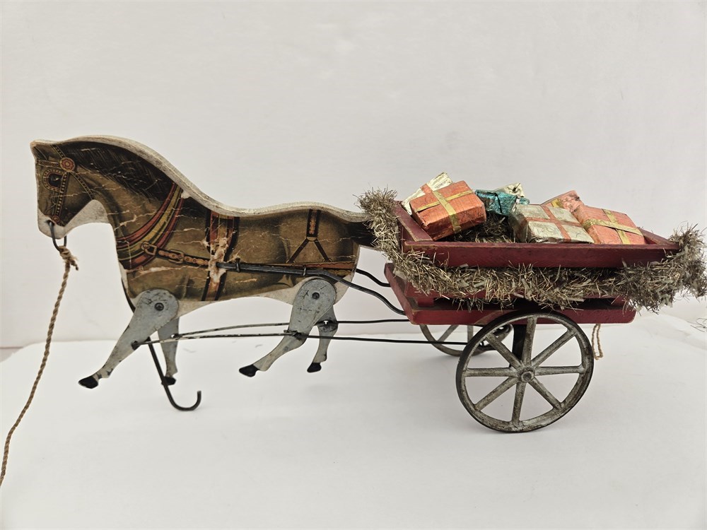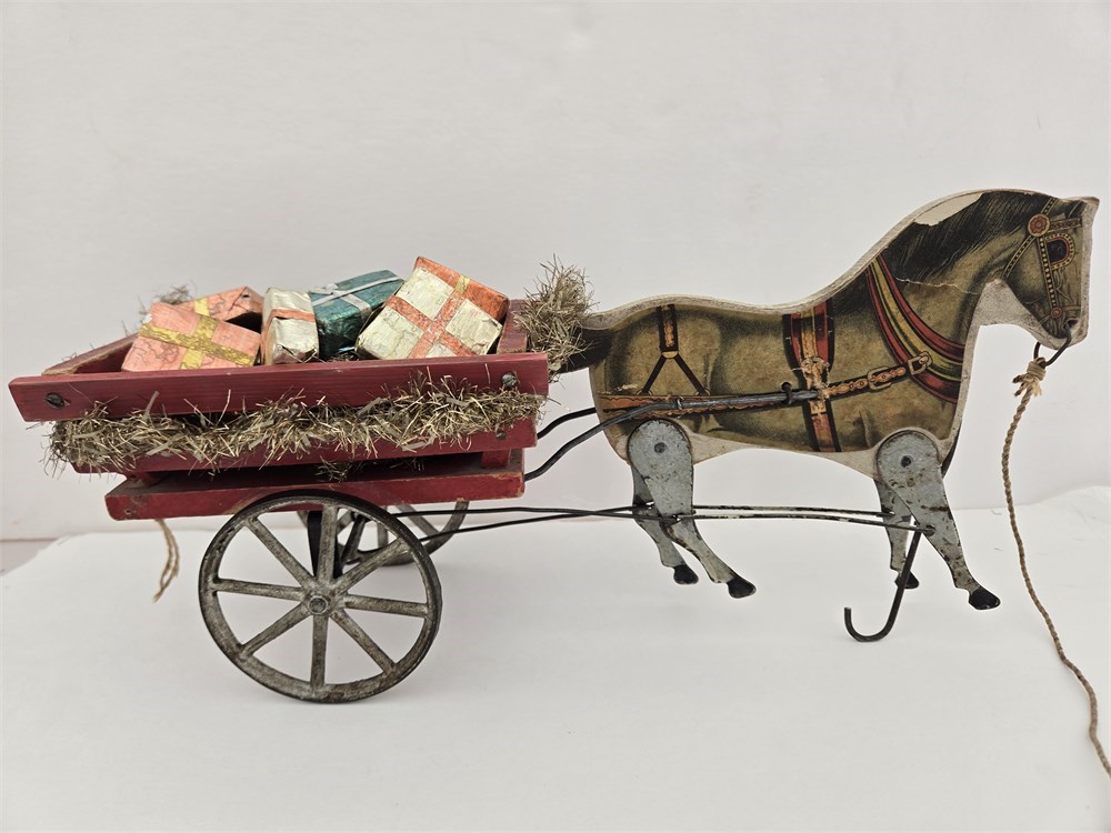 A charming and hard-to-find early 20th-century horse-drawn Christmas pull toy, featuring a lithographed paper-over-wood horse with articulated tin legs, connected by its original wire harness to a red painted wooden wagon. The wagon is decorated with period tinsel garland and filled with a group of early hand-wrapped Christmas gifts, giving this piece exceptional holiday display appeal.