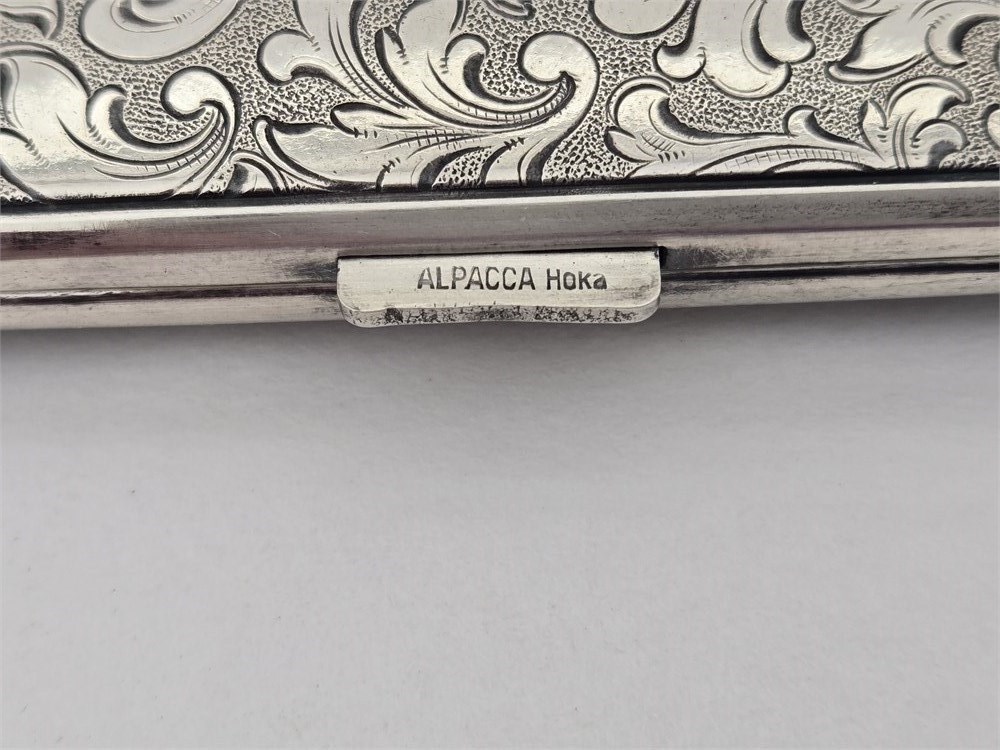 Offered is a beautifully detailed vintage German cigarette case, marked “ALPACCA HOKA”, featuring ornate engraved scrollwork on both sides and a softly curved Art Deco silhouette. “Alpacca” refers to the traditional German nickel-silver alloy valued for its silver-like appearance and durability.