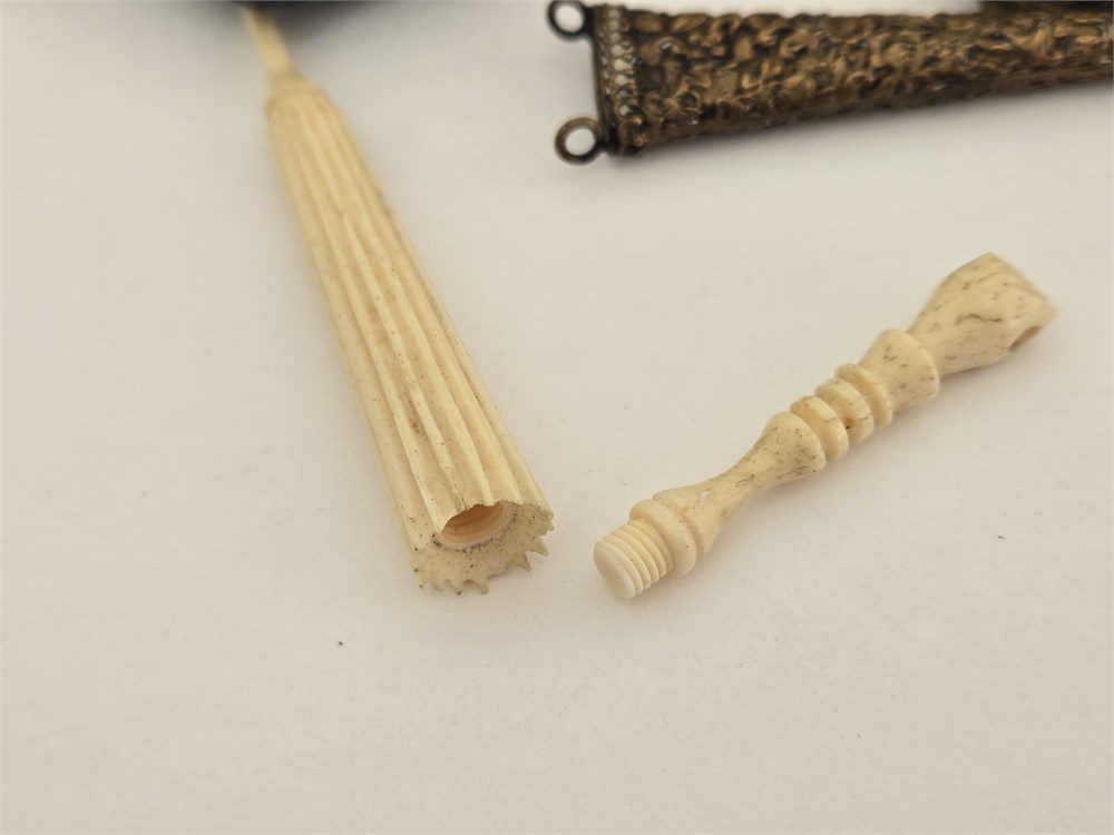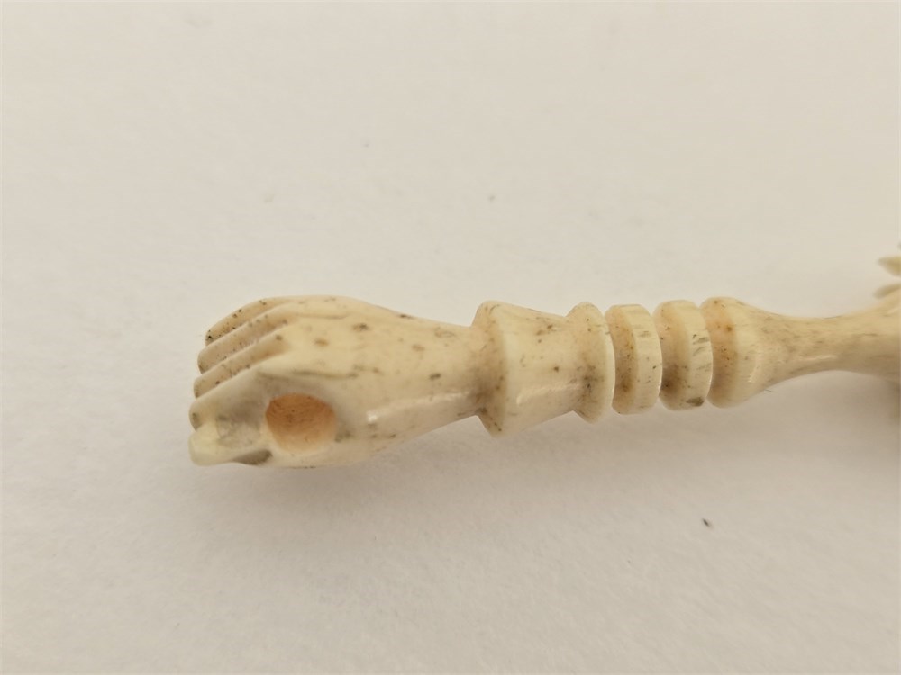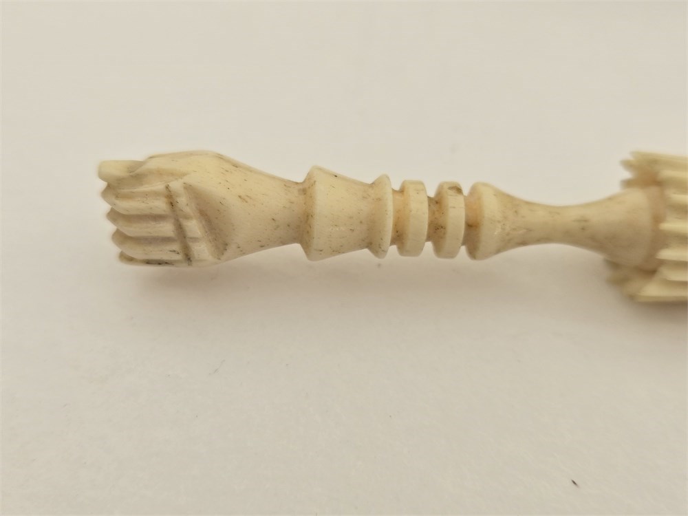 Victorian carved bone sewing handle with threaded end and tiny fist finial (beautiful detail)