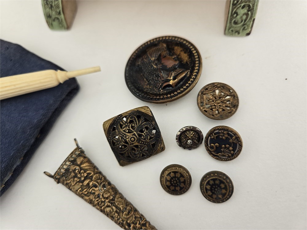 Condition is antique with expected age wear, patina, and imperfections to the box and notions. A wonderful ready-made “sewing drawer treasure lot” for collectors, assemblage artists, or anyone who loves antique textiles and tools.