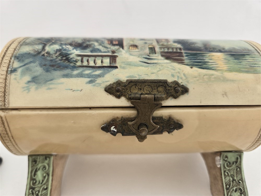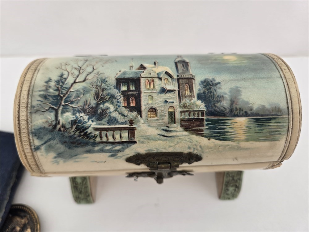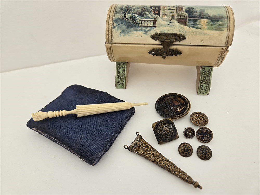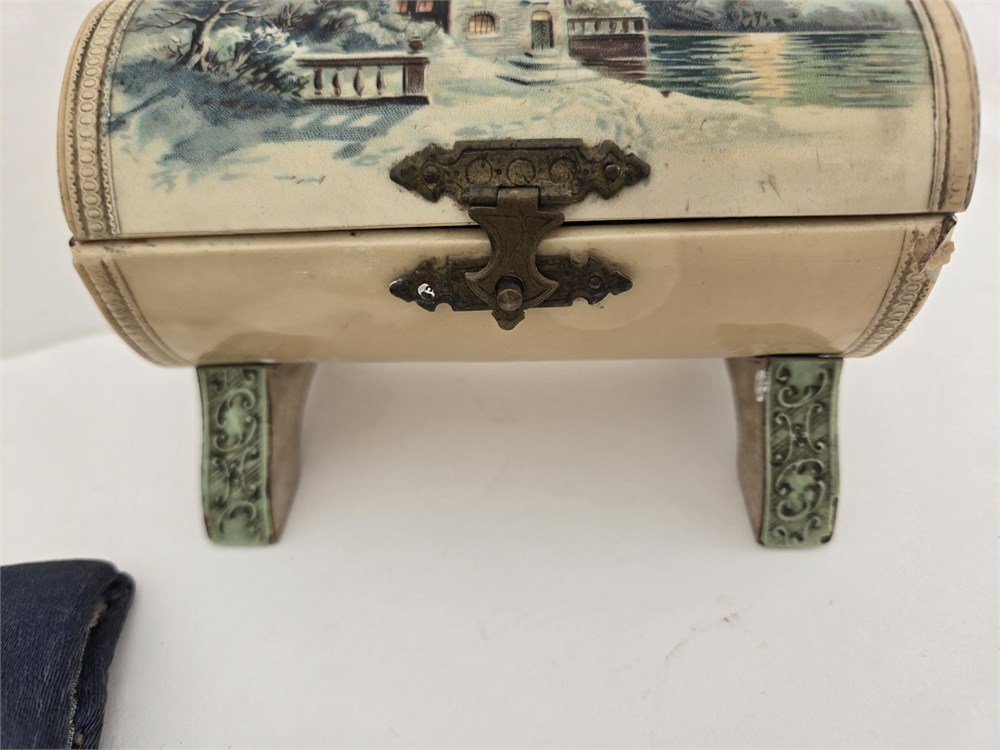 Offered here is a charming small grouping of antique sewing accessories, all found together and selling as one lot. The centerpiece is an early 1900s celluloid trinket chest featuring a lithographed lakeside cottage scene and four ornate legs. The interior shows age and wear but has excellent antique character. It is very worn inside and the outside has loss and discolorations but it's still a unique sewing box.
