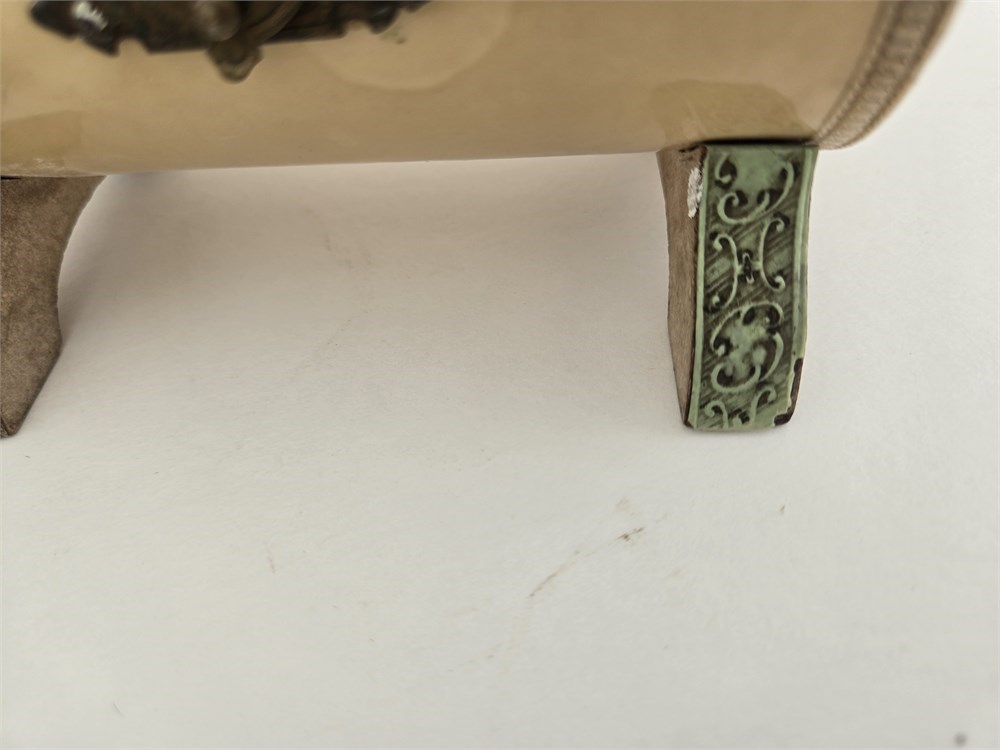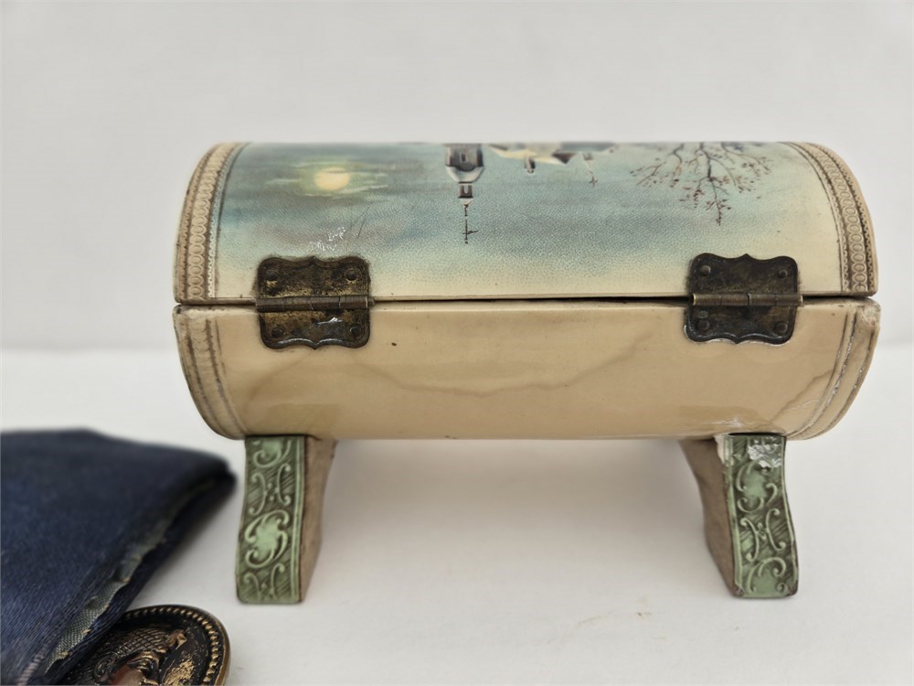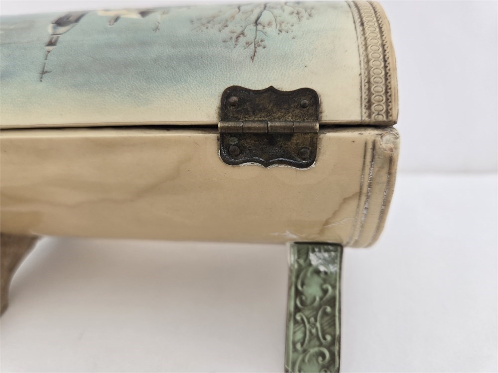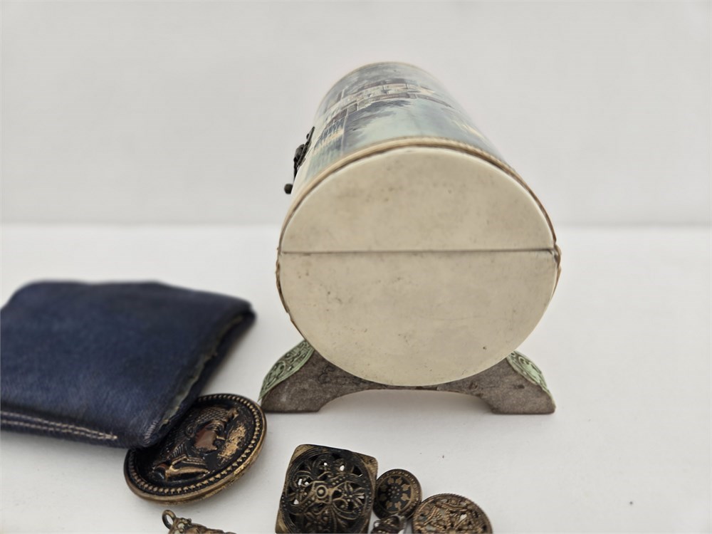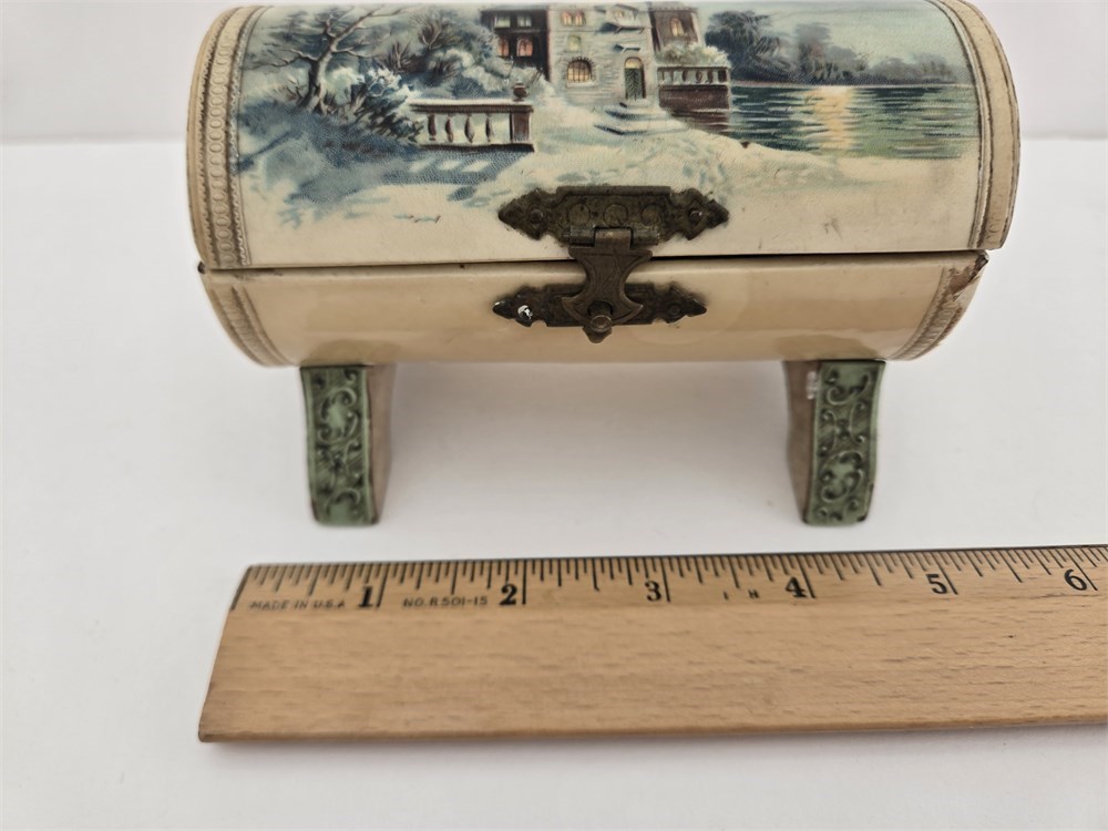 Offered here is a charming small grouping of antique sewing accessories, all found together and selling as one lot. The centerpiece is an early 1900s celluloid trinket chest featuring a lithographed lakeside cottage scene and four ornate legs. The interior shows age and wear but has excellent antique character. It is very worn inside and the outside has loss and discolorations but it's still a unique sewing box.