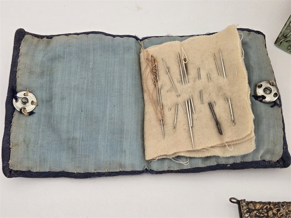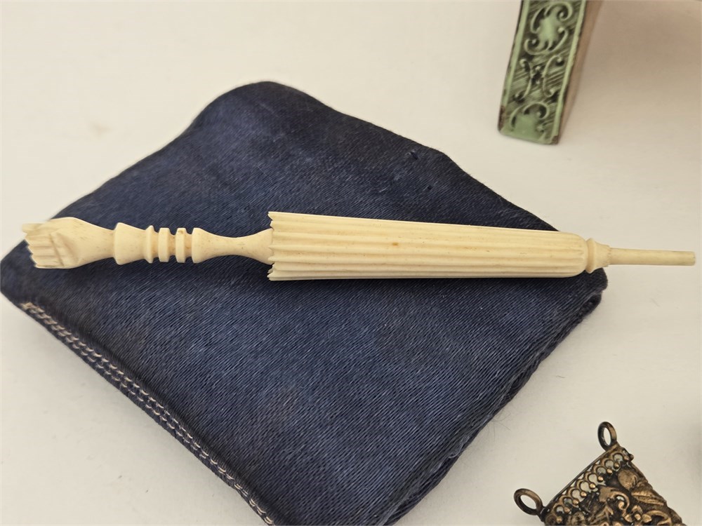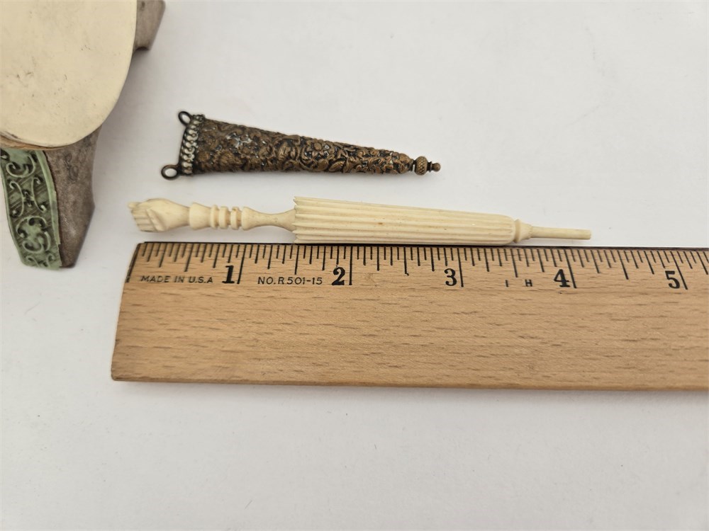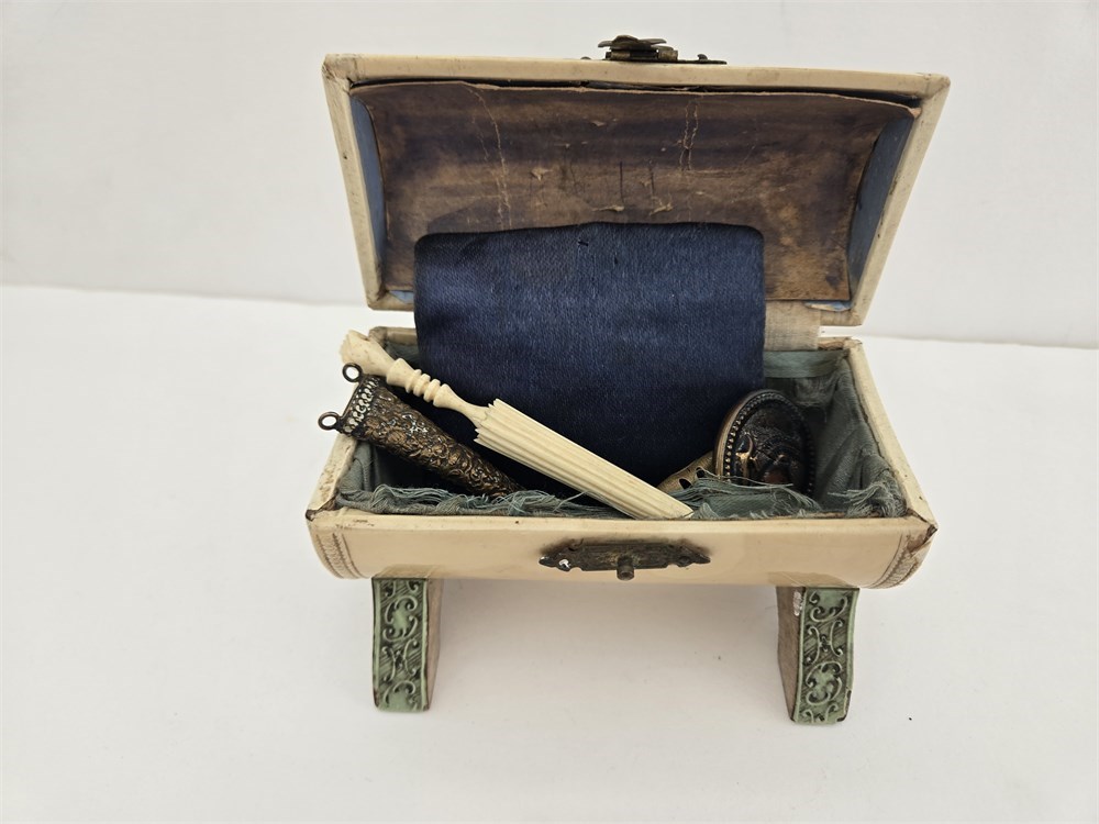Antique Sewing Box Lot Celluloid Chest,victorian umbrella bone needle holder,+