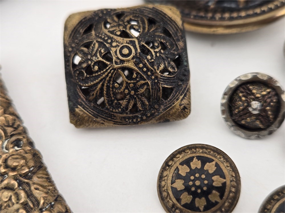 Six antique buttons, including one large picture button and several brass/tinted examples