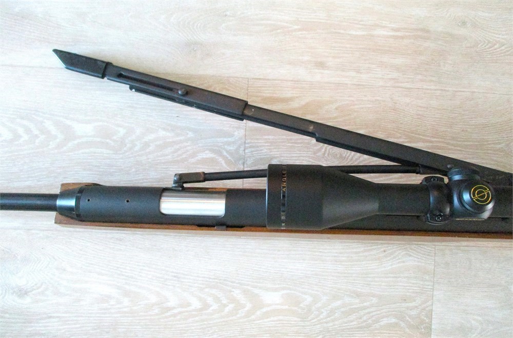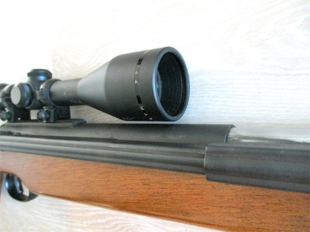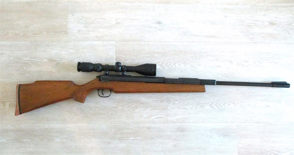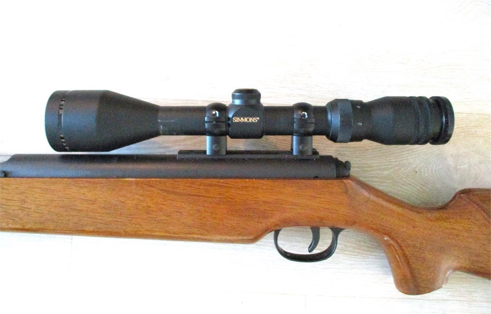 This is a great vintage piece.  Brolin Arms, side cocking .177 Cal, 1000 fps, high pressure, spring loaded, piston driven, with adjustable target trigger.  This includes, Simmons variable power scope, and original sights and owners manual.  The stock has a beautiful grain, no dings, dents only some bluing loss to the front of the barrel, otherwise only normal age related wear. It measures 46" in length.  There is a reserve price of $100.00.  It is in great vintage condition.
