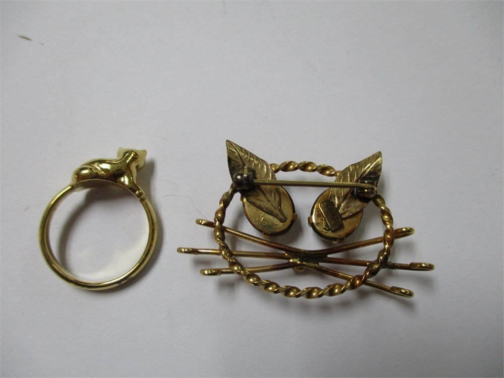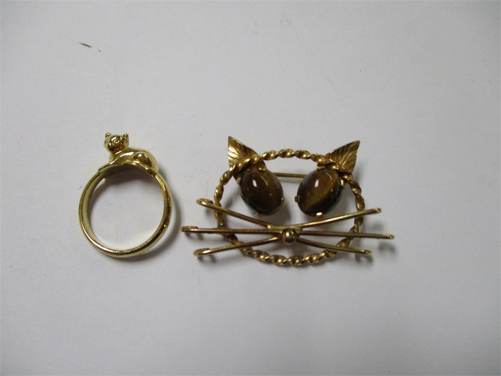 Vintage, 2 piece Lot, 12K GF Cat Pin w/Tigers Eye Eyes and GP Cat Ring Sz 5.75