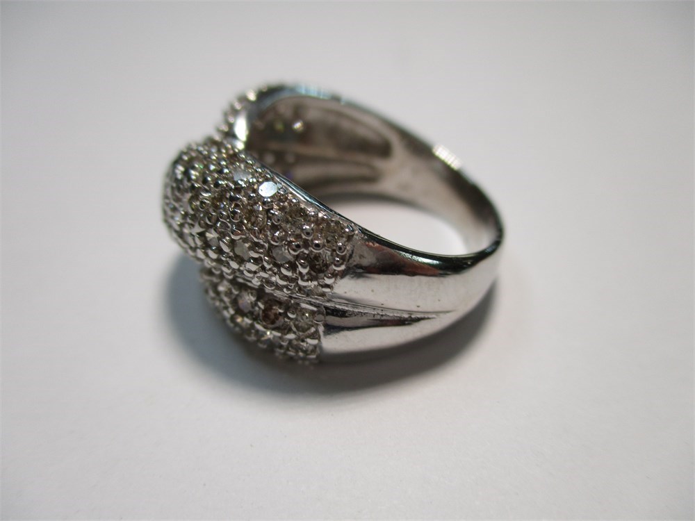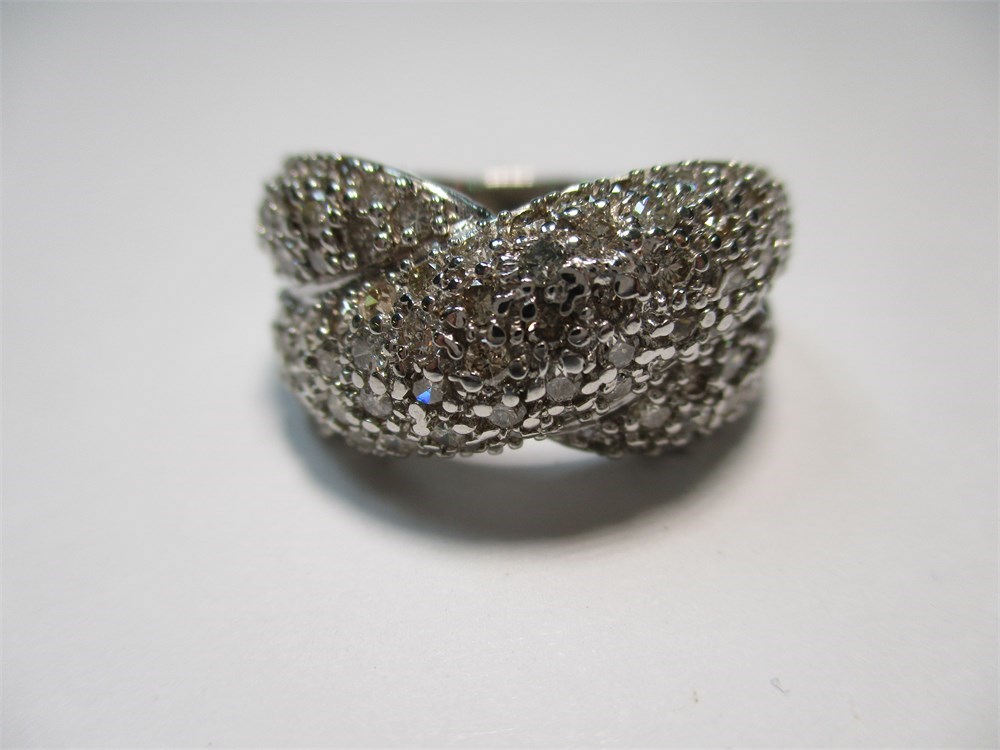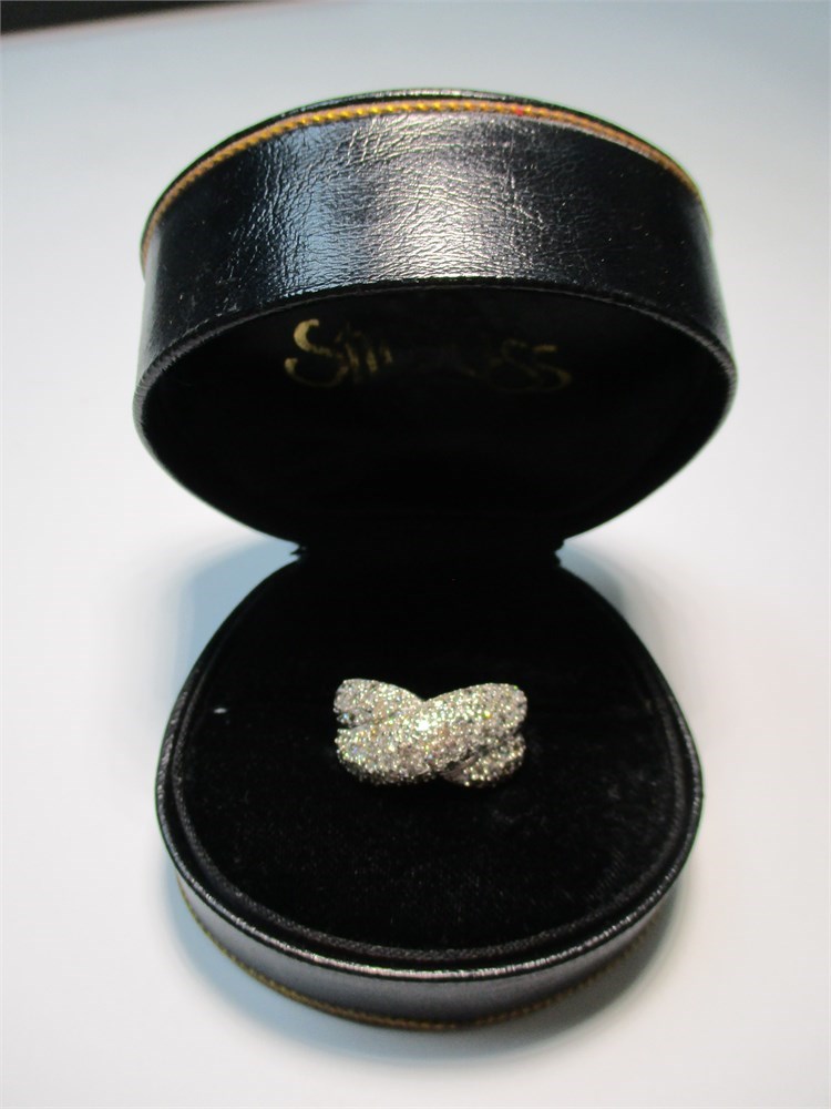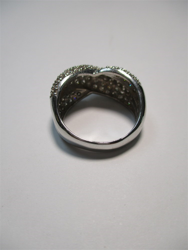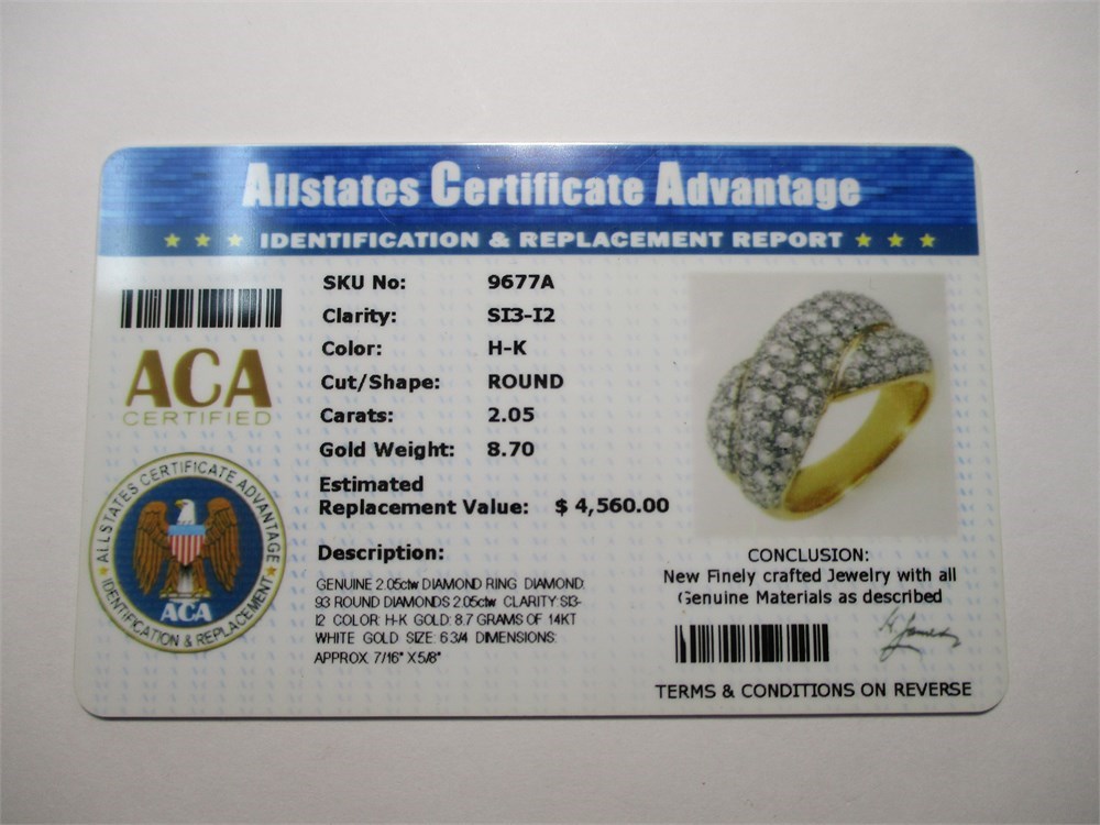 This is a Beautiful, Genuine and Authenticated, 14K Gold and Diamond Criss-Cross Ring with 93 round Diamonds totaling 2.03 cts., and 8.7 grams of Platinum over14K Gold.  This Ring has a Classic Style with a Stunning Presence and sits comfortably on the finger. It is ACA certified.  The original owner of this ring was allergic to Gold so she had this ring plated in Platinum hence the hallmarks cannot be seen.