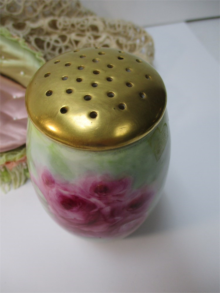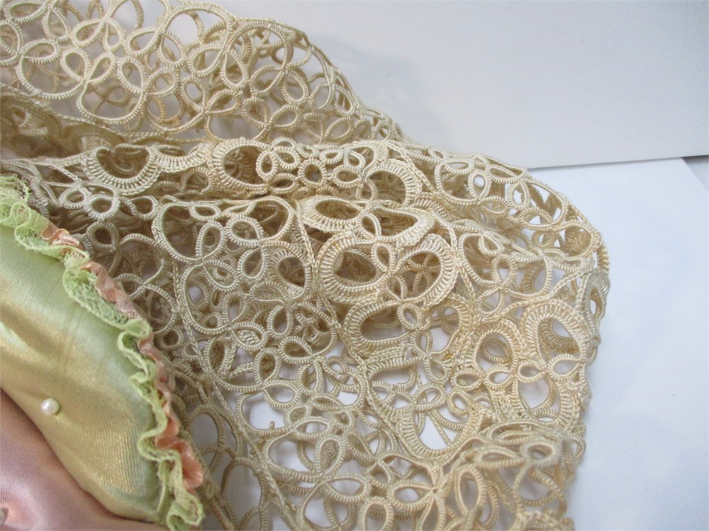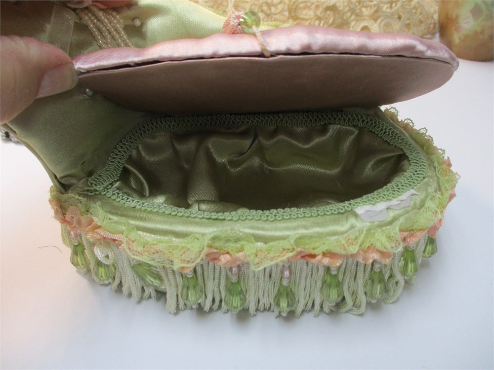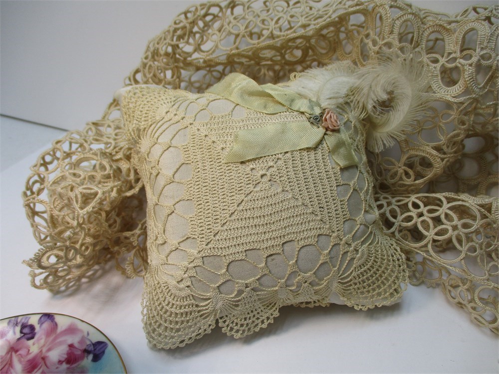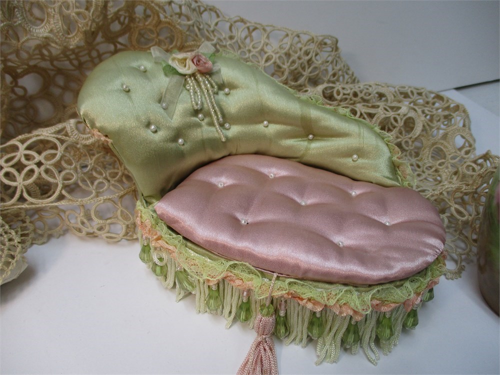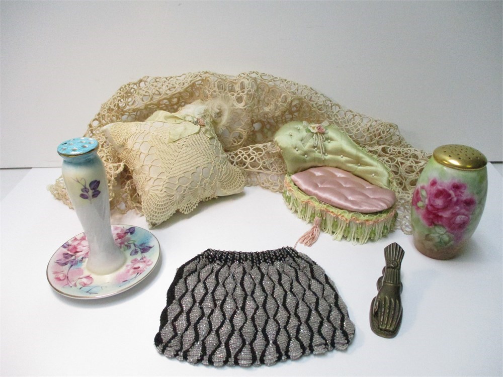 This is a wonderful lot consisting of both antique and vintage pieces.  Two lovely porcelain Limoges Hat Pin holders, lovely oval tatted doily, lace wrapped pin cushion, beaded bag that it not complete, a Victorian hand paper clip (repro) and a miniature, tufted and beaded chaise lounge keepsake box. All these items have been lovingly cared for and are in great condition.