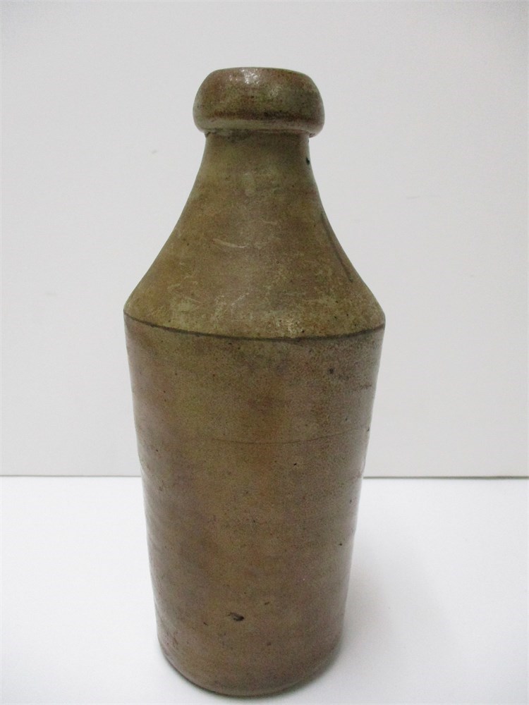 This is a 19th-century salt-glazed stoneware bottle, used for ginger beer, soda water, or mineral water, stamped: