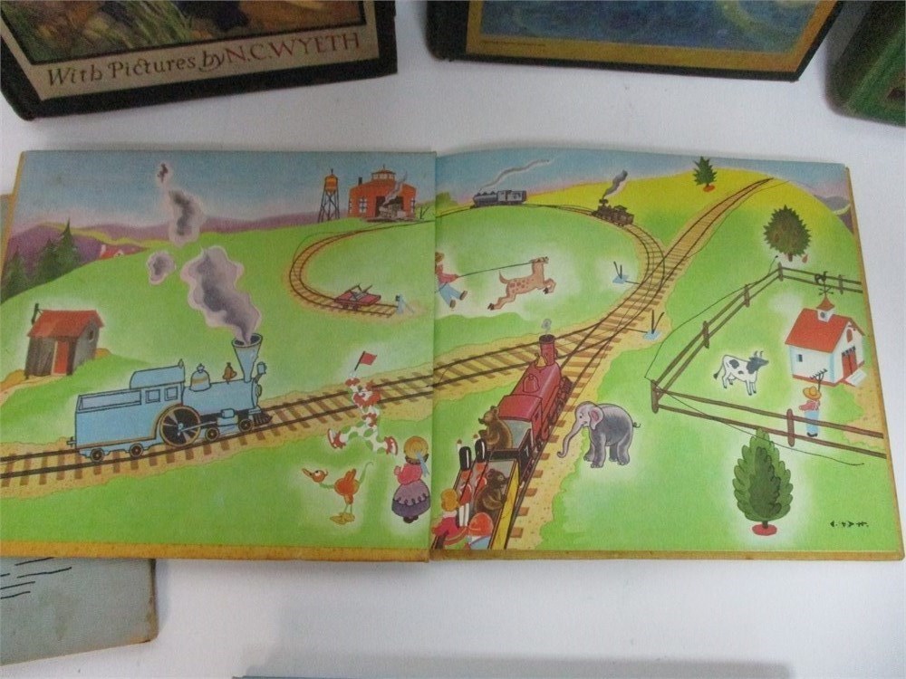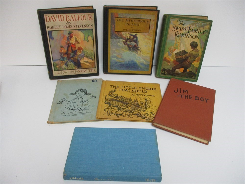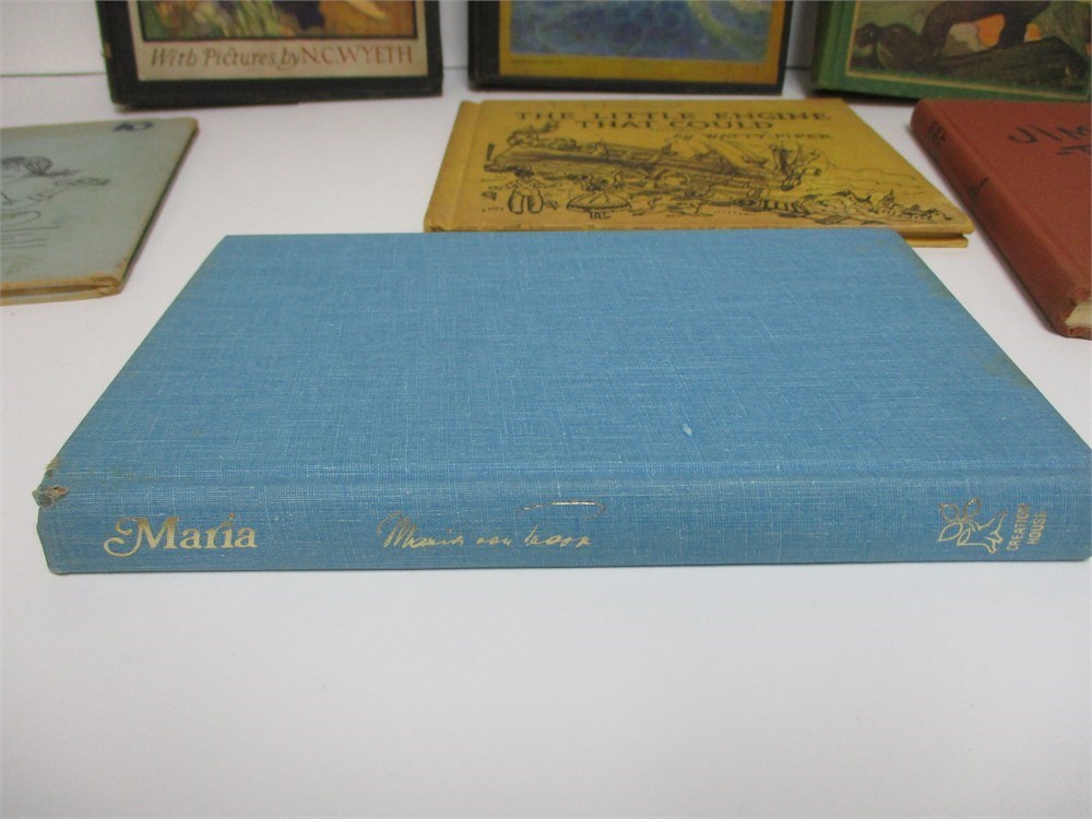 A vintage lot of hardbound books, including, Swiss Family Robinson, Mysterious Island, David Balfour, Maria, Jim the Boy, Little Engine that Could, Shoes for Angela, Ingersol the Magnificent signed by the author Joseph Lewis, Maria is signed by Maria Von Trapp, Jim the Boy is signed by the author Jim Washburn. All in good used condition except there are some ink marks on the cover of Little Engine that Could and some wear to the binding on Ingersoll the Magnificent.