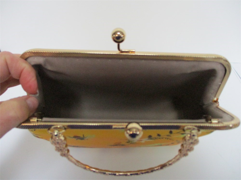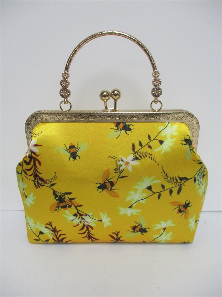 A Beautiful Gold Satin Bee and Floral Handbag.  Lovely design, a polished gold-tone frame and handle with kiss ball closure, taupe fabric lining with pocket.  It also comes with a 24" detachable chain for converting to a shoulder bag and the bottom of the bag has feet for protection.  It measures 9" at its widest by 10" tall including handle.  It is brand new and never been used!