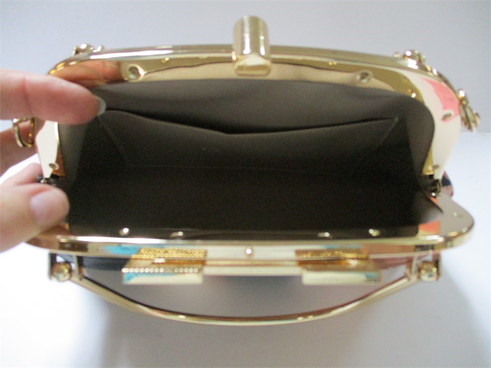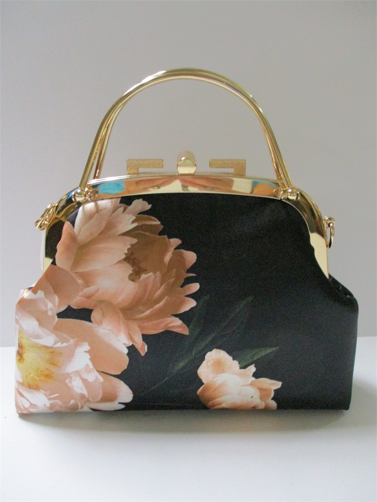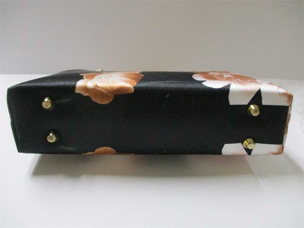 A Beautiful Black Satin & Rose Floral Handbag.  Lovely design, a polished gold-tone frame and double handles with vertical barrel closure, taupe fabric lining with pocket.  It also comes with a 24" detachable chain for converting to a shoulder bag and the bottom of the bag has feet for protection.  It measures 9.5" at its widest by 9" tall including handle.  It is brand new and never been used!