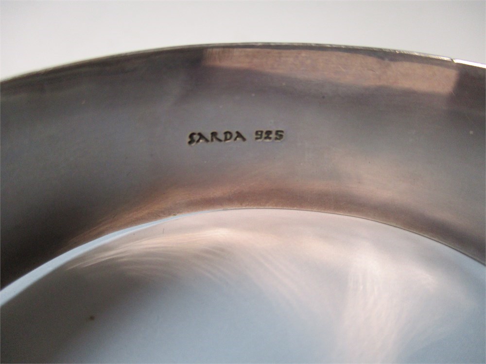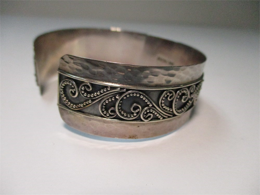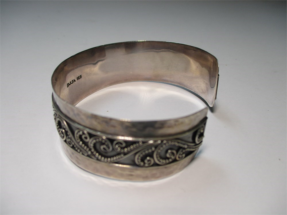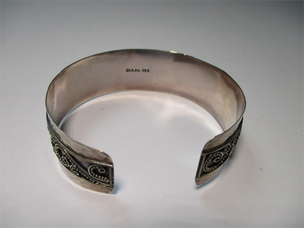 This is a lovely Sterling Silver Bracelet with an ornate scroll pattern.  The contrast with the dark oxidation behind the pattern highlights the detailed craftsmanship.  Signed "Sarda 925". Fits a 7-7.5" wrist comfortably and measures .75" wide.