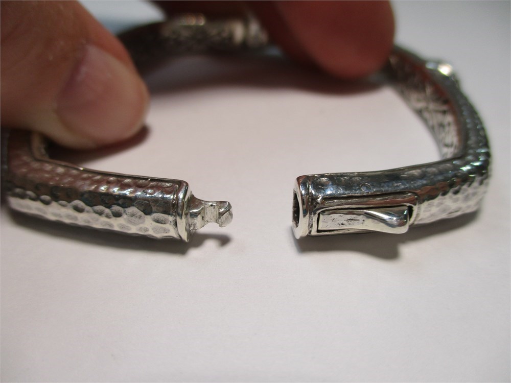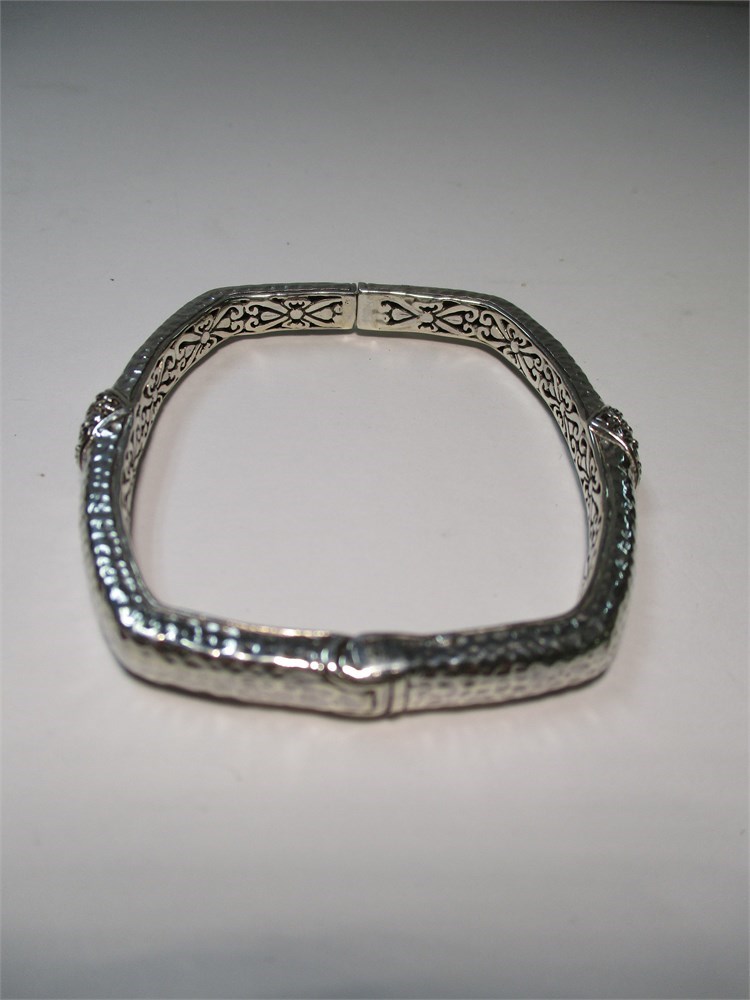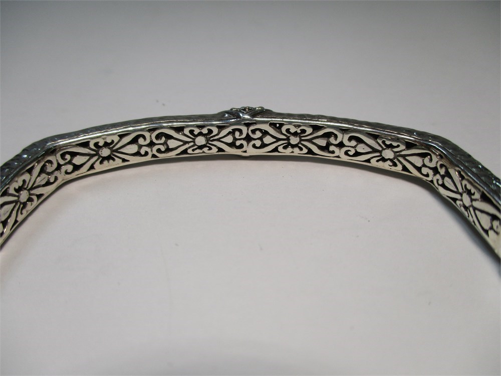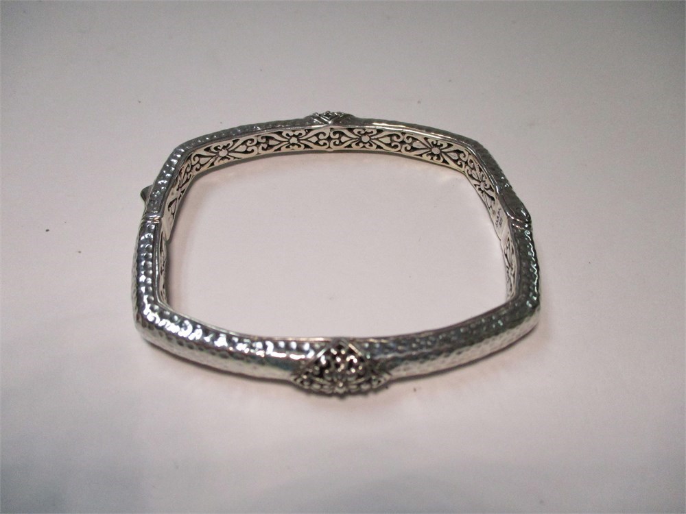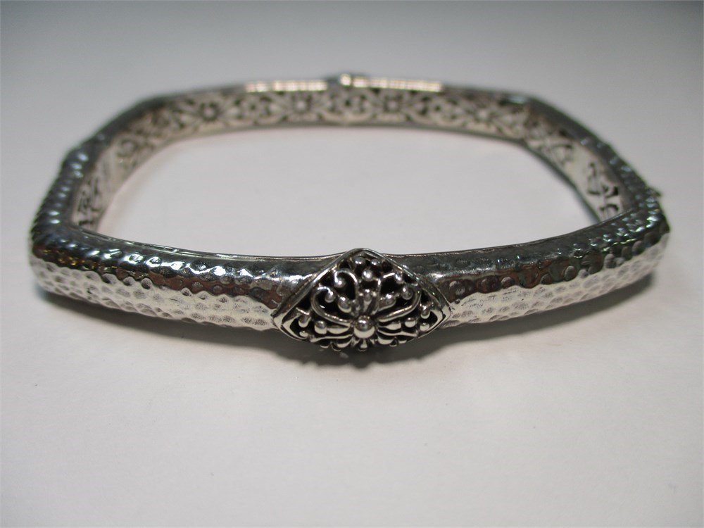 This is a lovely Sterling Silver Square Bracelet is handcrafted from Bali and has a beautiful hammered finish with raised scroll detail on the East and West points and the inside has beautiful floral detail.  This particular design is called "His Glory Gives Us Light".  Signed "Sarda 925". Fits a 7-7.5" wrist comfortably.