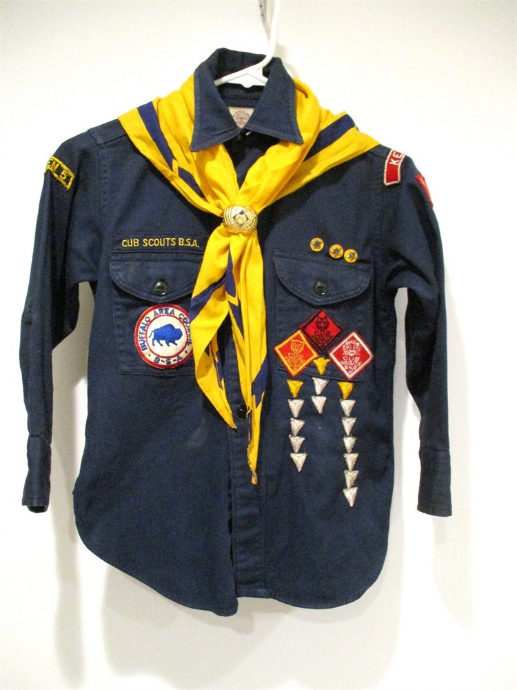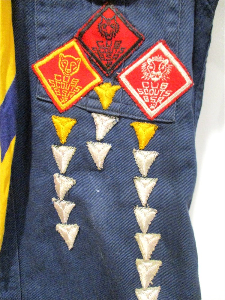 A very nice vintage Cub Scout uniform with Cap, Scarf and Neckerchief Slide.  It has many badges and 3 pins for years of membership 1, 2 & 3.  It is an official Cub Scout uniform in good vintage condition, just might need a washing.  No Odor !
