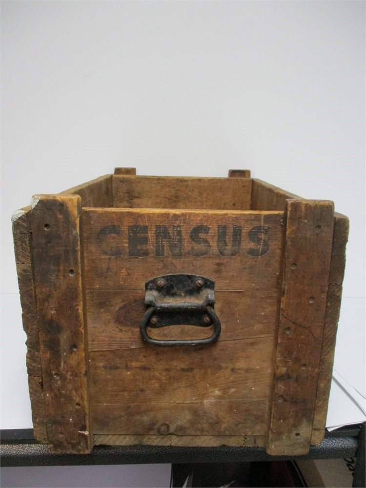Antique wooden storage crate with metal handle, stenciled “CENSUS” on the front.