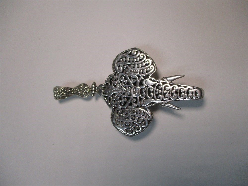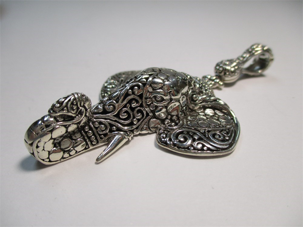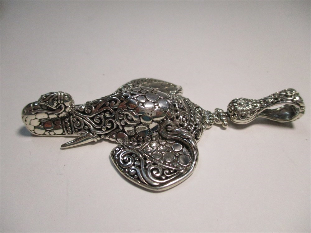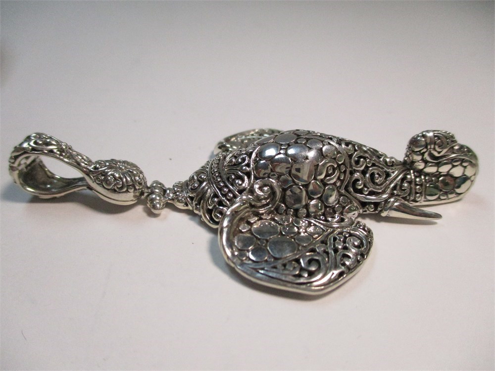 A lovely Sterling Silver Ornate Elephant Head Pendant.  The design and craftsmanship originated from Bali Indonesia.  This is a revered symbol of wisdom, strength and good luck with an upward trunk often believed to shower good fortune.  It measures 3" long including bail, 1.75" across & .5" high.  It has a nice size bail to accommodate a variety of chains.