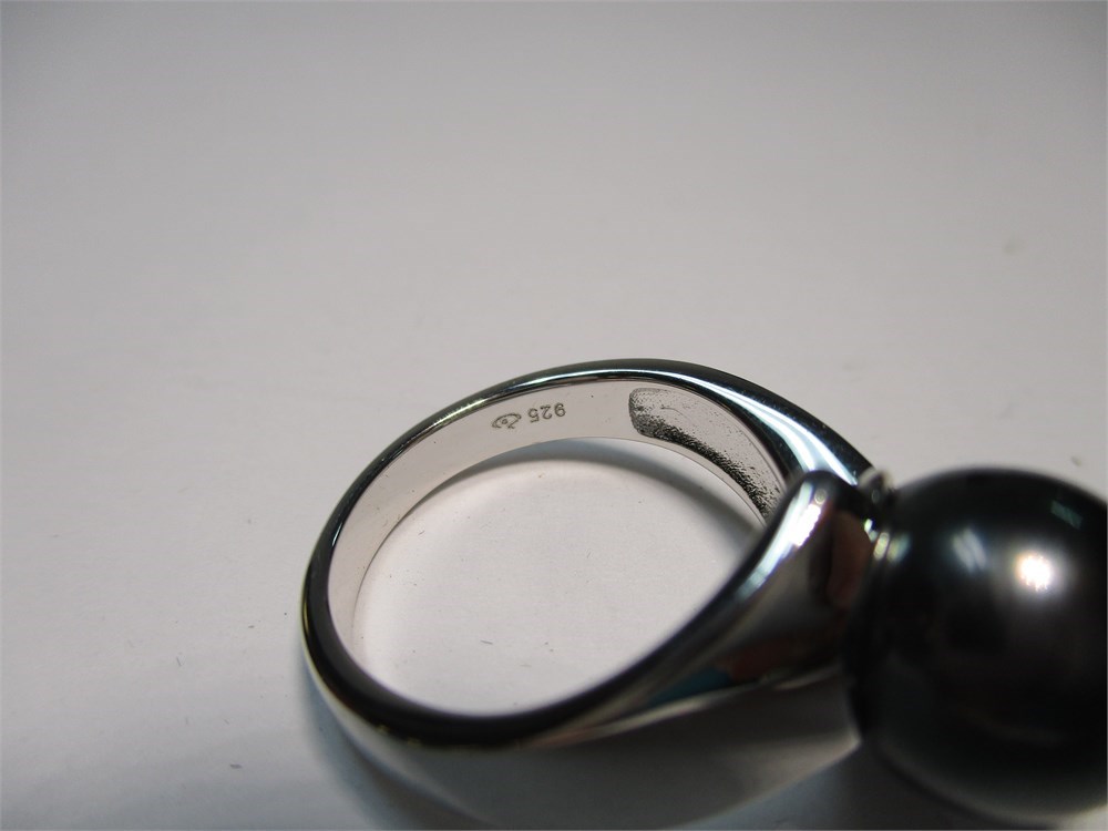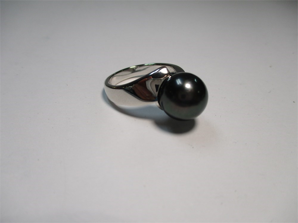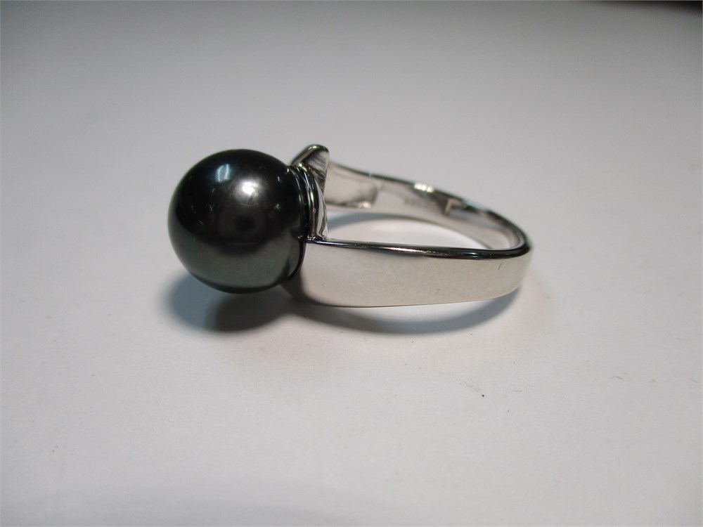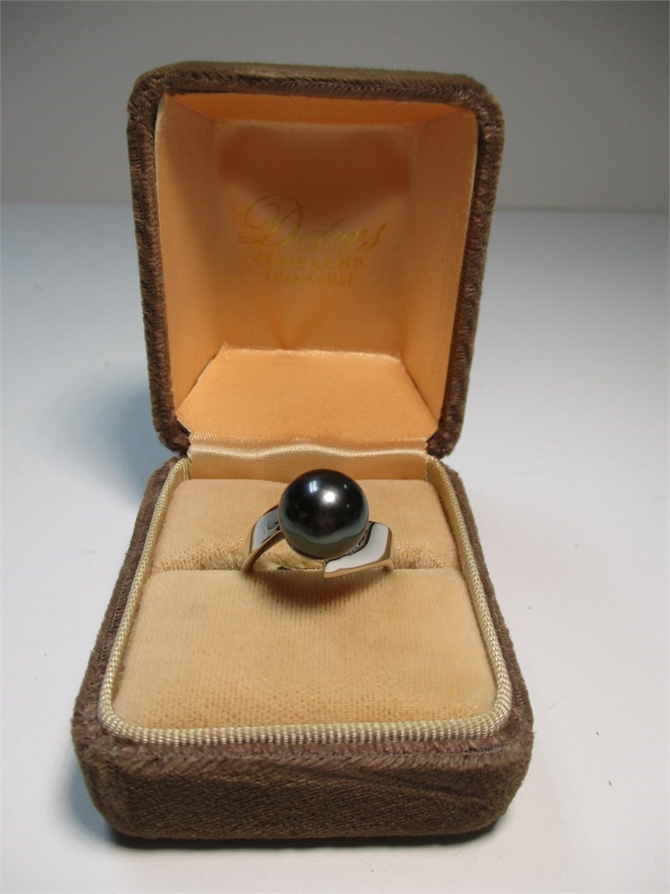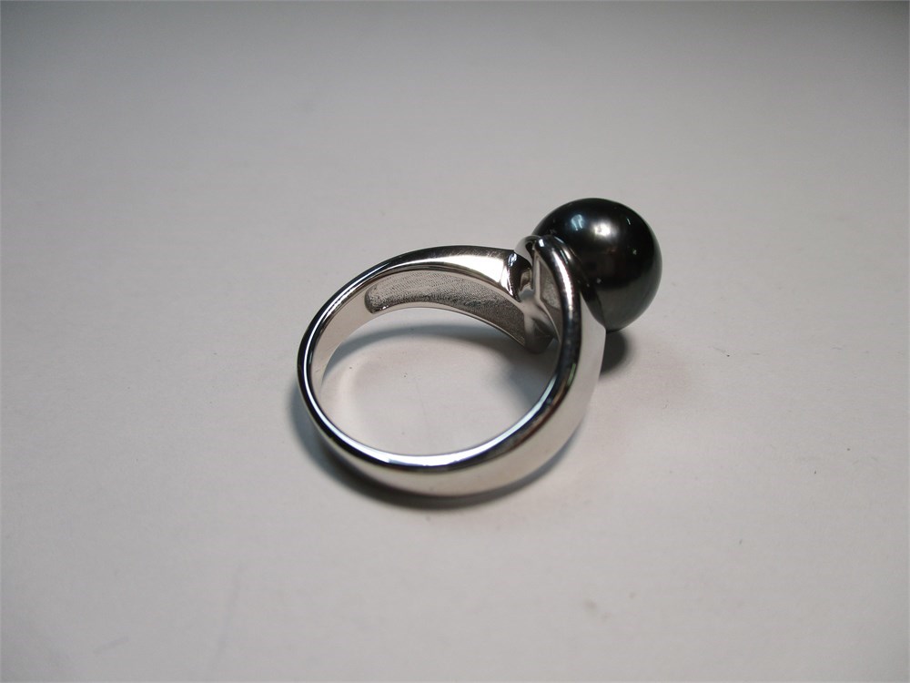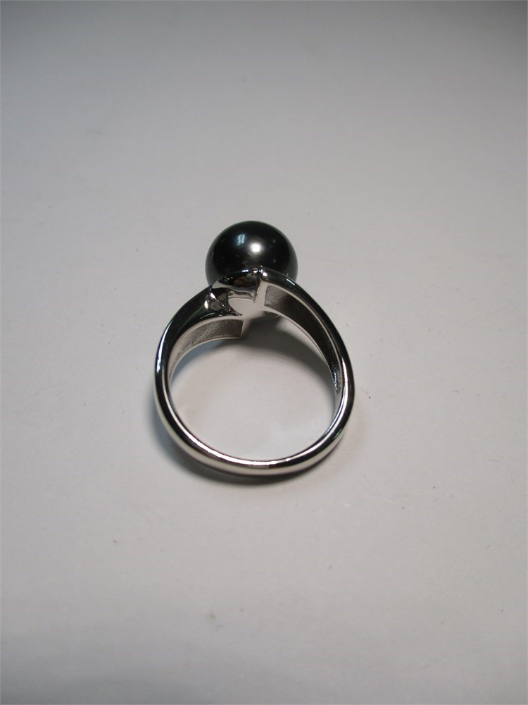 A lovely Sterling Silver and 10-11MM Black Pearl Ring.  The Pearl sits atop a stylized bypass style band in Sterling Silver.  It fits a 7.5-8" finger.  The ring box shown is only for display purposes and not included.