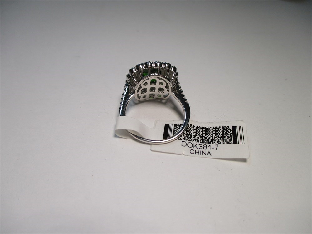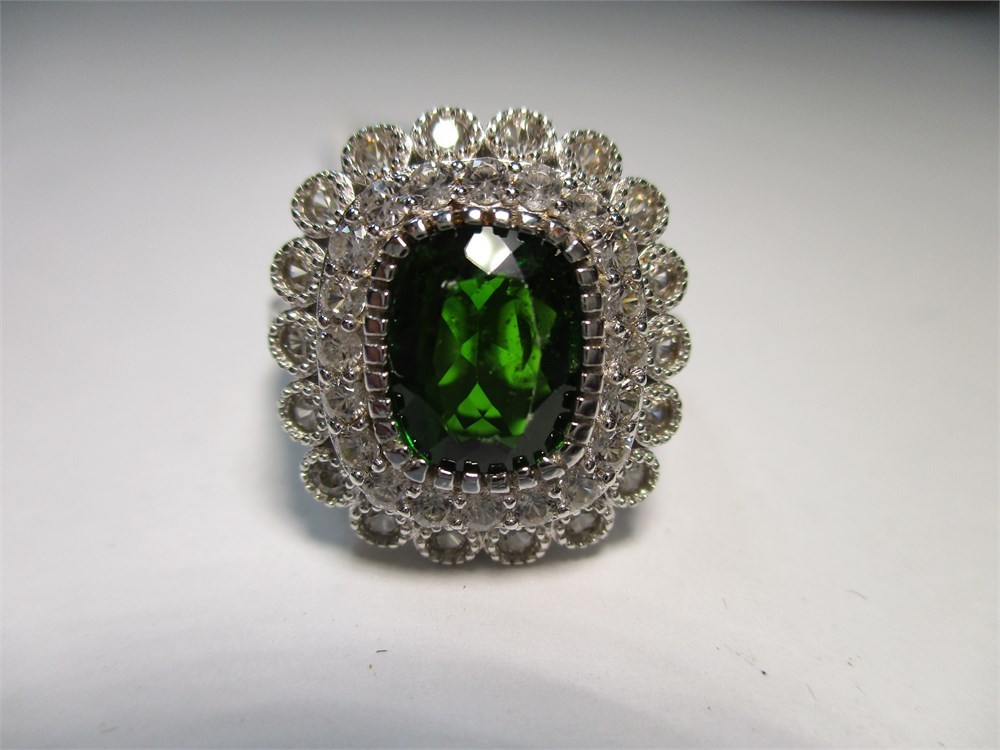 A lovely Sterling Silver and Green Octagon Cut surrounded by White Round Cut CZ's Ring and CZ's also on the shank.  Fits a 7.5-8" finger.  5.15 tw., China.   The ring box shown is only for display purposes and not included.