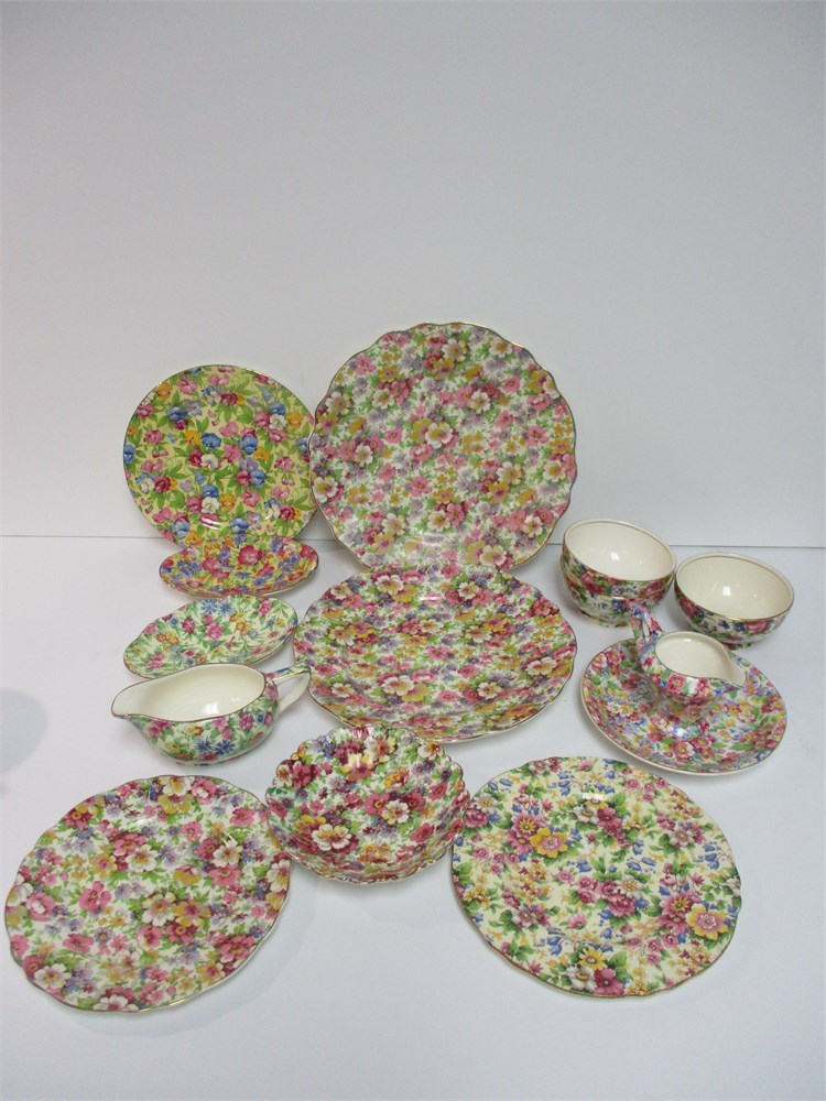 A wonderful Vintage 14 Piece Lot of Chintz tableware in assorted patterns and styles.  All pieces are in wonderful condtion and lovely colors so typical of Chintz.