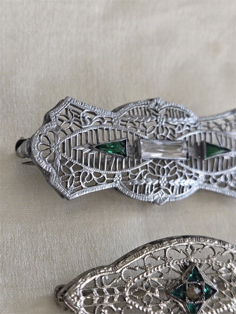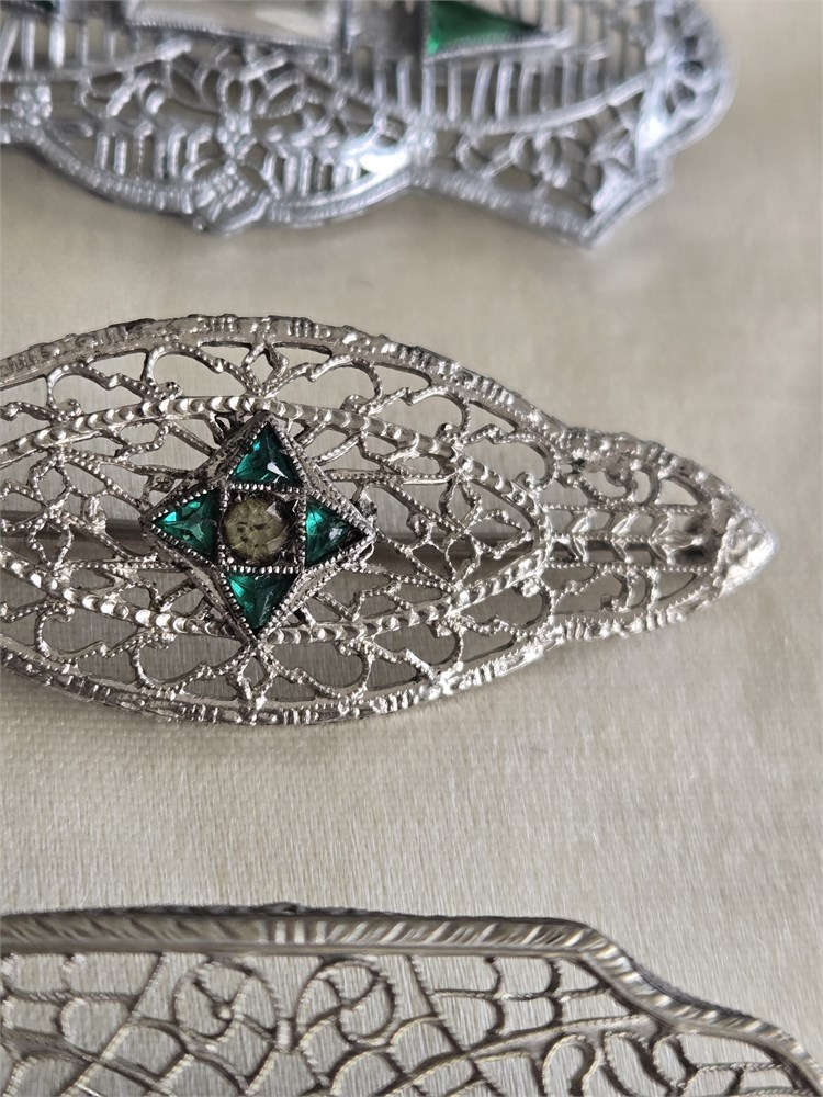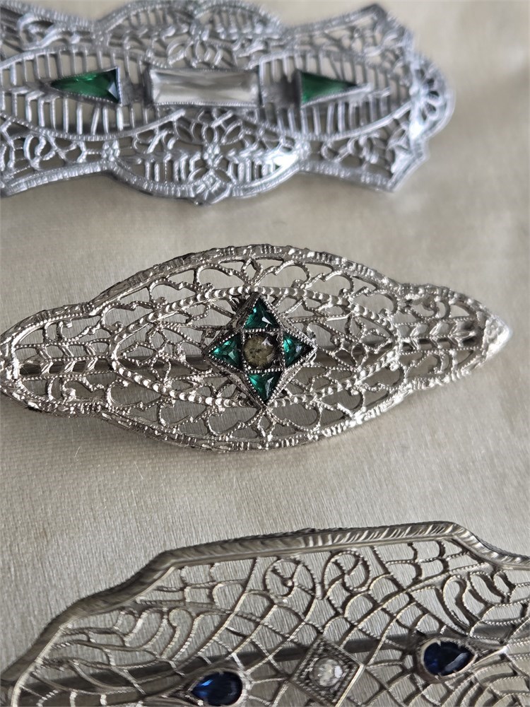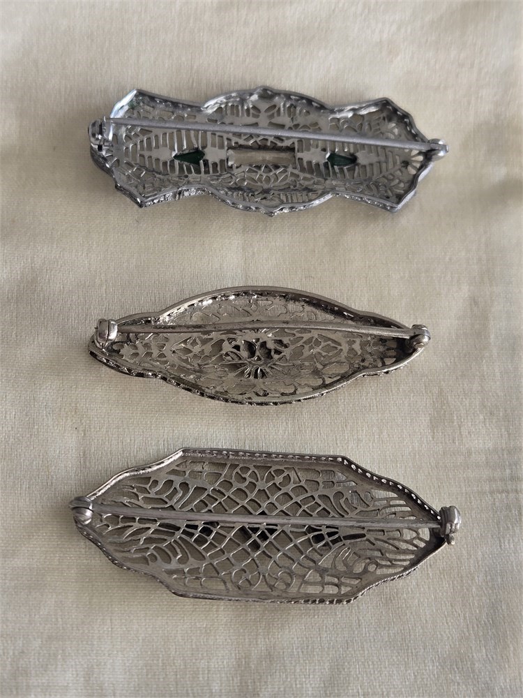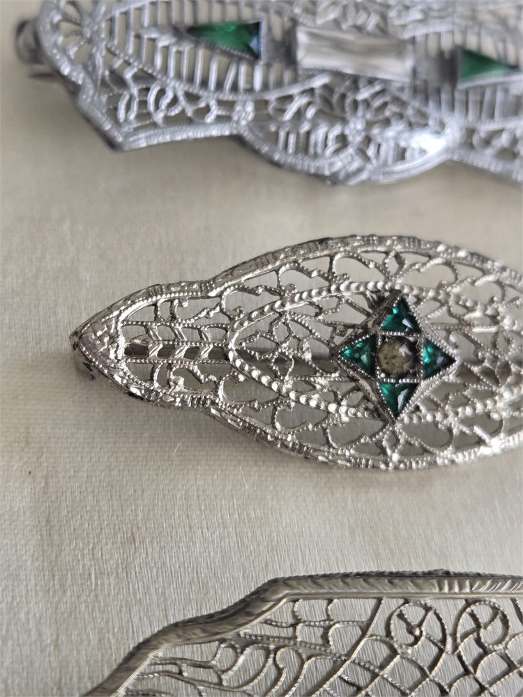 Lot of 3 Antique 1920s Art Deco Filigree Brooches • Rhodium Plated Glass Stones