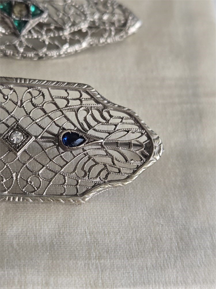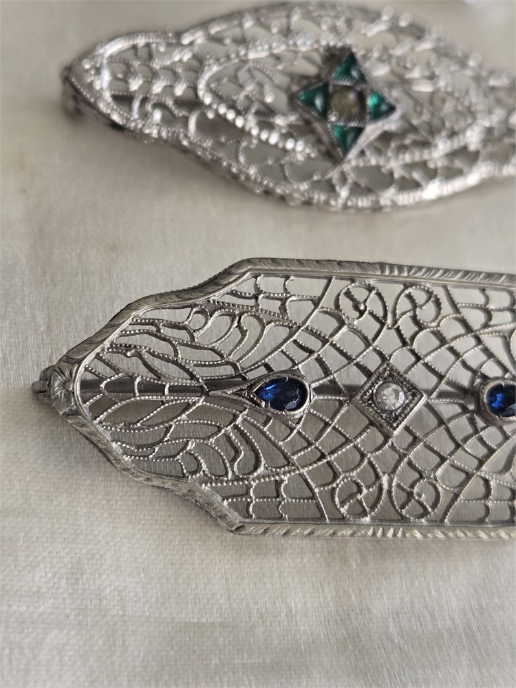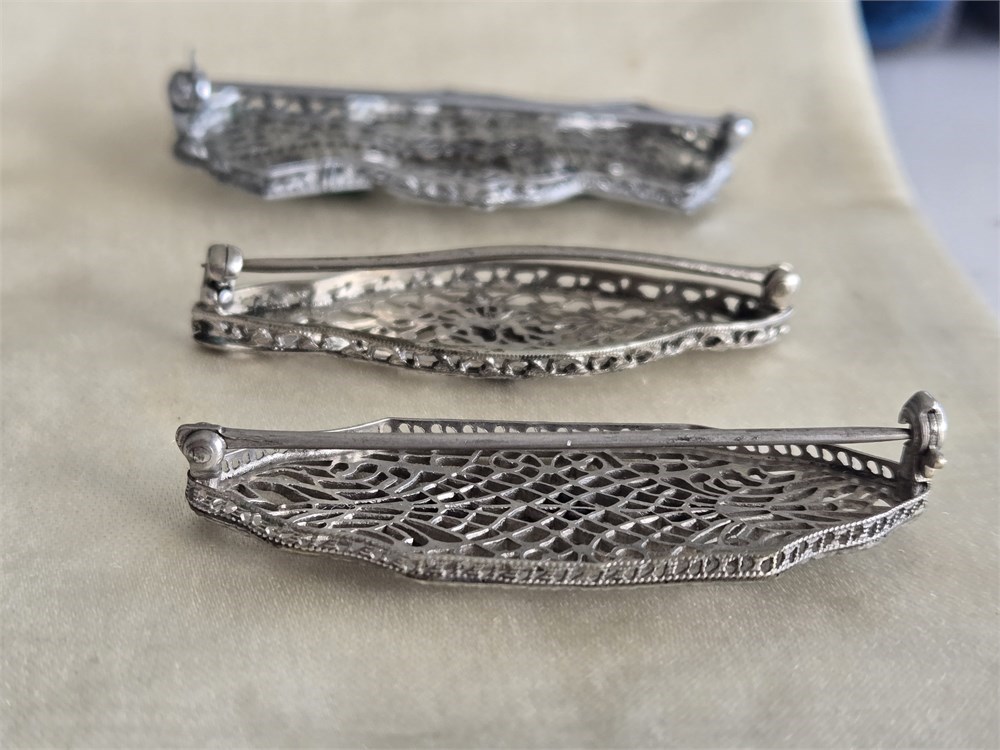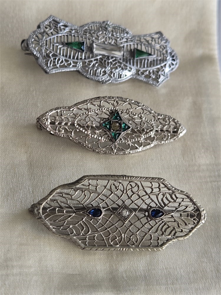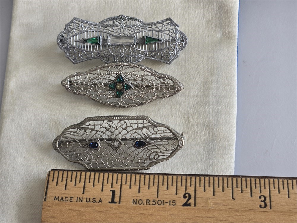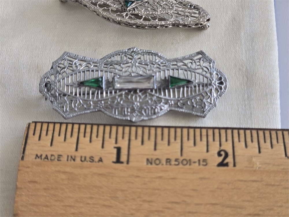 Lot of 3 Antique 1920s Art Deco Filigree Brooches • Rhodium Plated Glass Stones