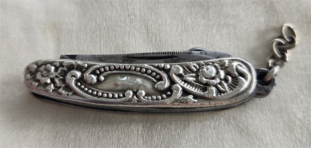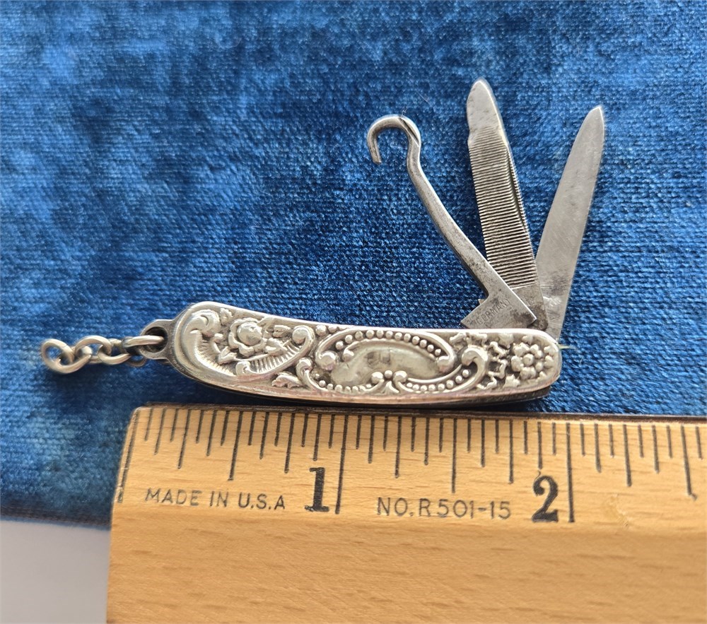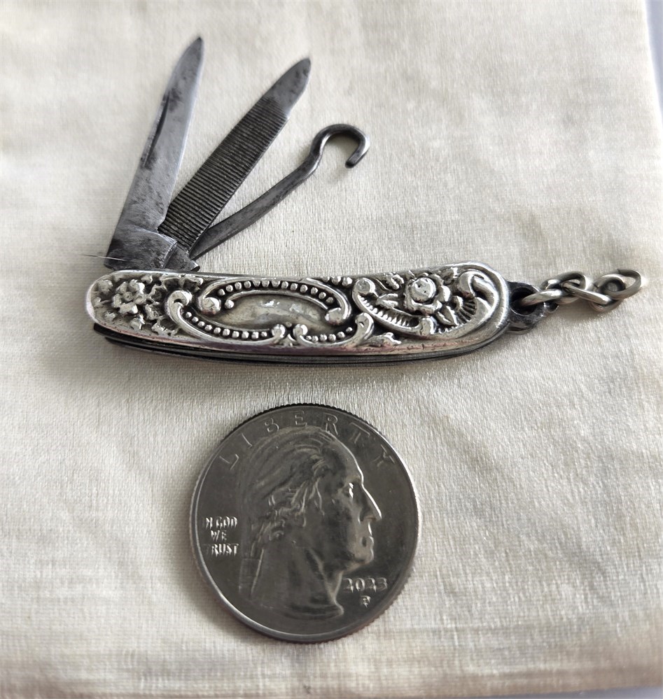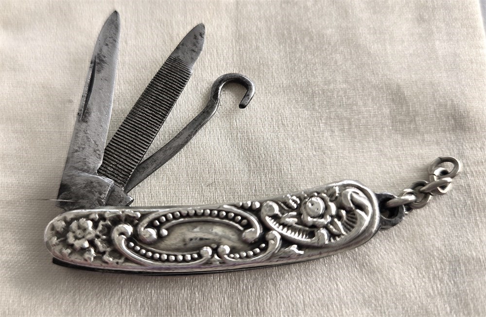 This auction is for a beautiful antique miniature chatelaine knife featuring an ornate raised floral handle and three functional tools. These tiny multi-tools were carried by Victorian and early Edwardian ladies on a chatelaine, watch chain, or sewing chain—useful for sewing, grooming, and small daily tasks.