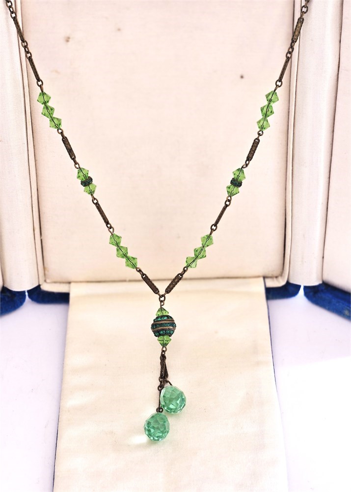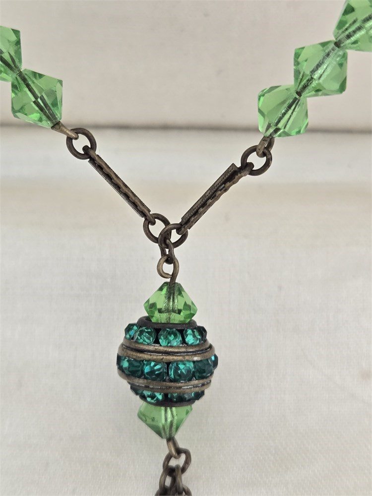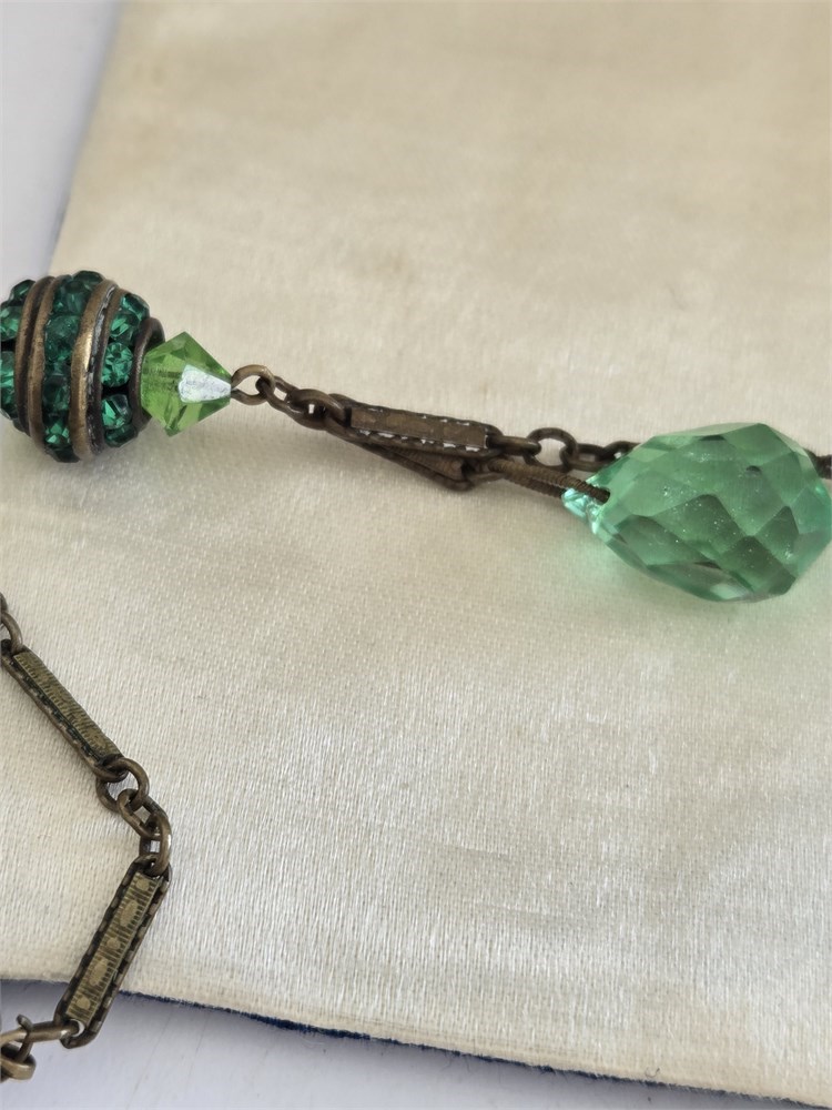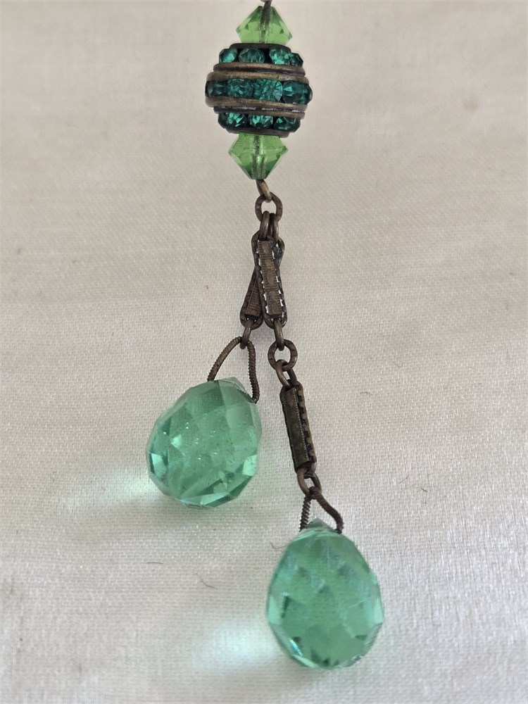 ANTIQUE 1920s ART DECO CZECH GREEN GLASS RHINESTONE DROP NECKLACE