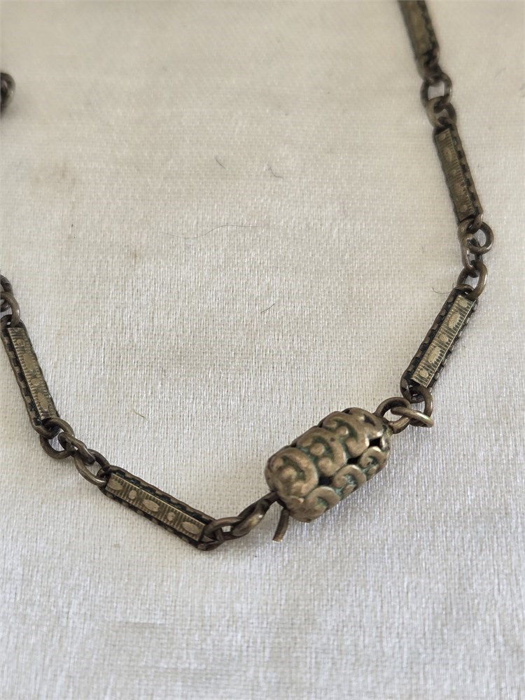 The chain retains its original patina and Deco-patterned barrel clasp. All beads are original and unpolished. Wonderful craftsmanship from the famous Czech glass workshops of Gablonz.