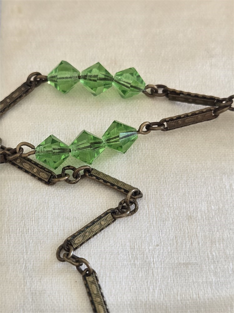 Beautiful all original Art Deco Czech necklace dating to the 1920s–early 1930s. Features hand-cut faceted green glass beads in the classic double-pyramid Czech style, connected by embossed brass Deco bar links. At the center is a striking green rhinestone ball with matching faceted glass beads, finished with two large teardrop drops that catch the light beautifully.