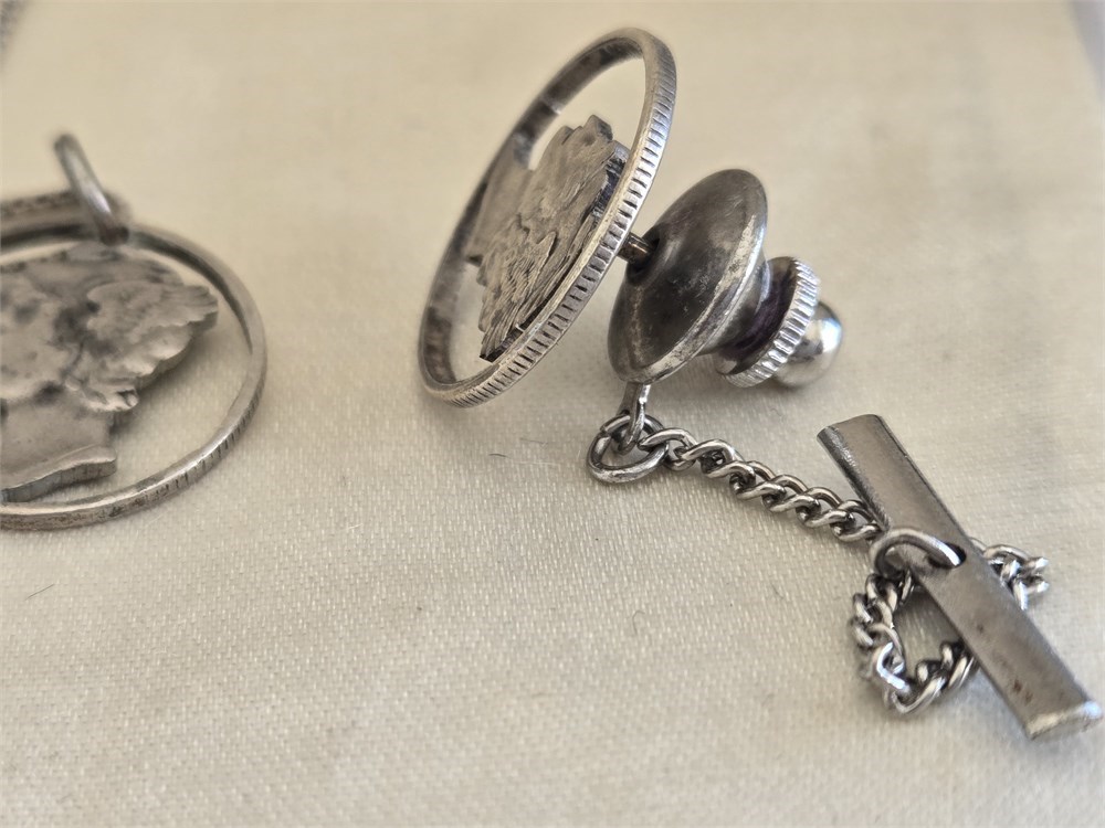 The pendant hangs from a marked 925 sterling silver box chain, and the matching piece is mounted as a tie tack with chain and bar. Wonderful detail and strong profile on both coin faces.