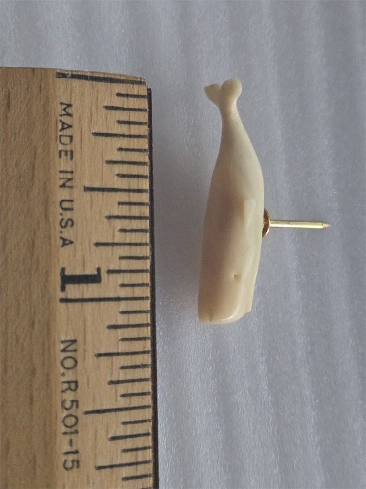 The whale body measures approximately 1¼ inches long. The pin is clearly marked 14K. The ivory shows natural grain and tiny age marks typical of older hand-carved pieces. No cracks or breaks, just light age wear.