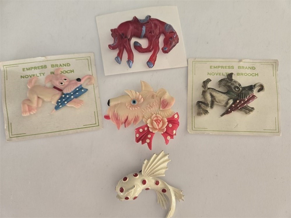 Lot of 5 Vintage Brooches 1950s 4 Japan Celluloid Novelty 1 metal fish
