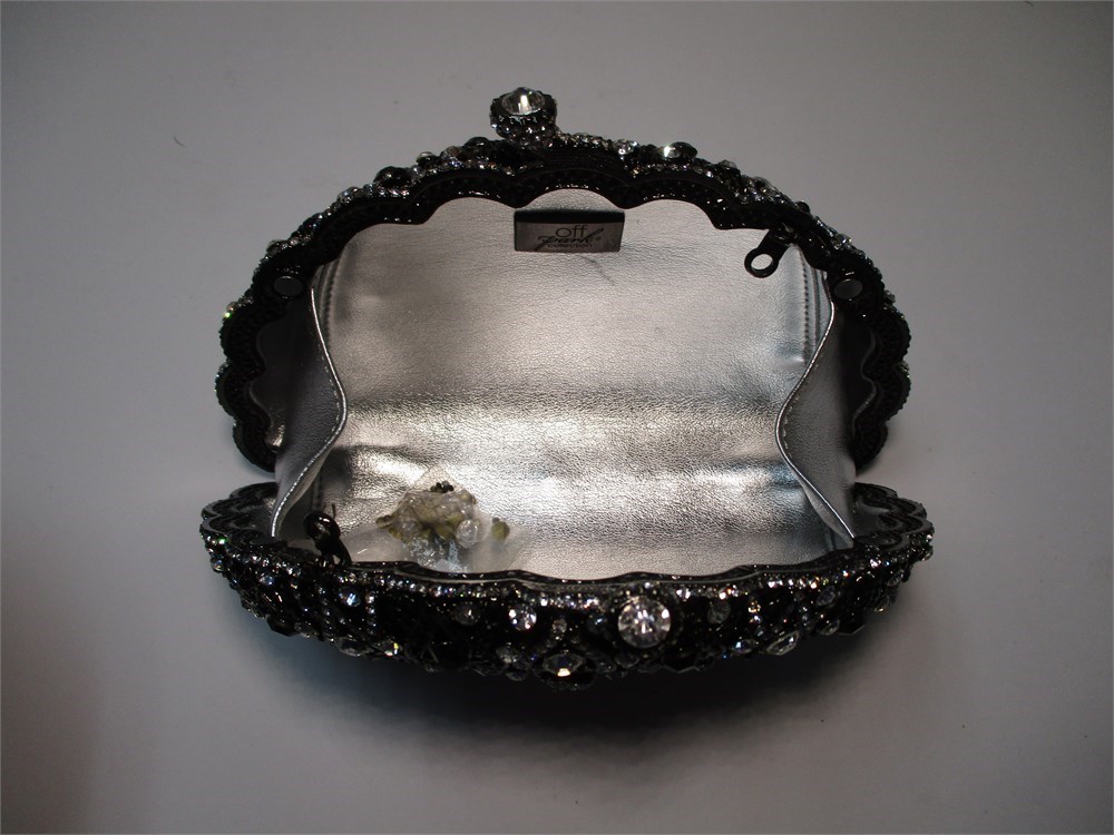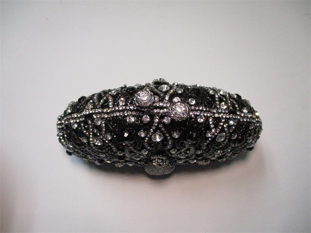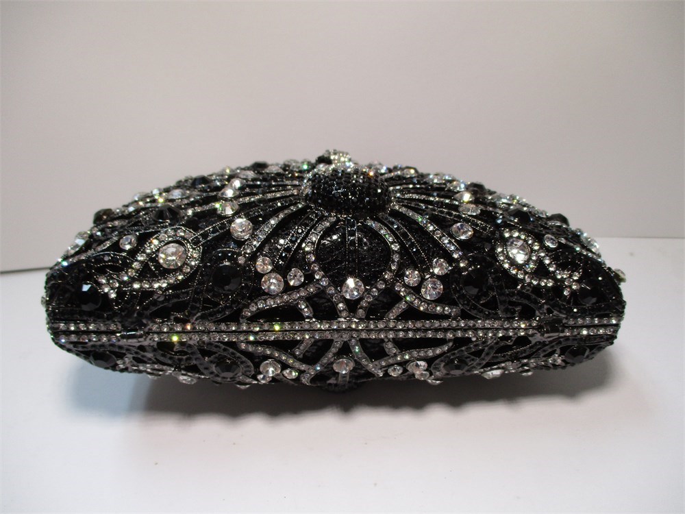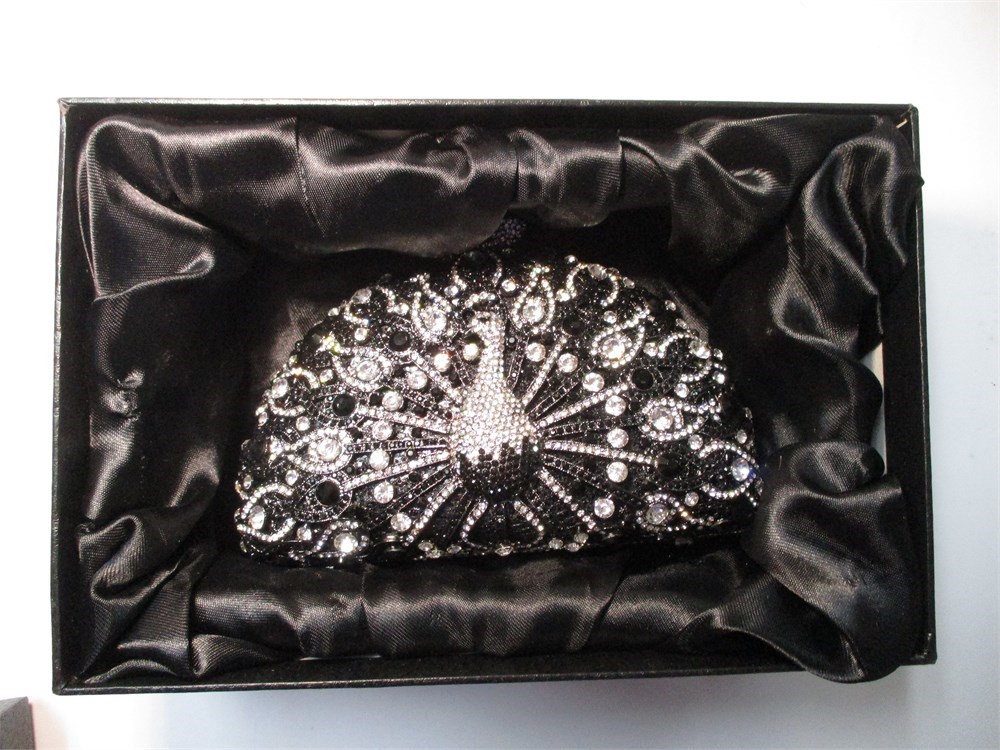 This very high end Rhinestone Clutch Bag has a beautiful Peacock front and center. Faux Hematite, Jet and Clear Rhinestones adorn this clutch perfectly.  It has a kiss ball closure and opens to revel a lovely silver satin fabric lining with gusseted sides.  It has a 20" gunmetal chain for conversion and also a small bag of Rhinestones if any need to be replaced.  It measures 6.5" at its widest x 4.5" high.  Comes in its original box!