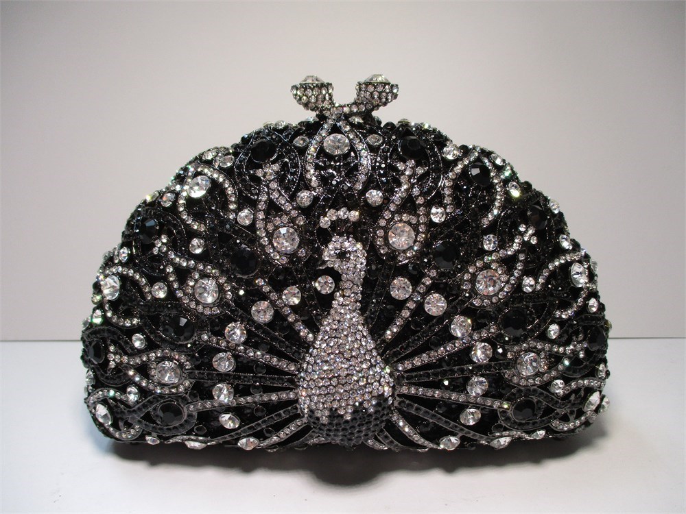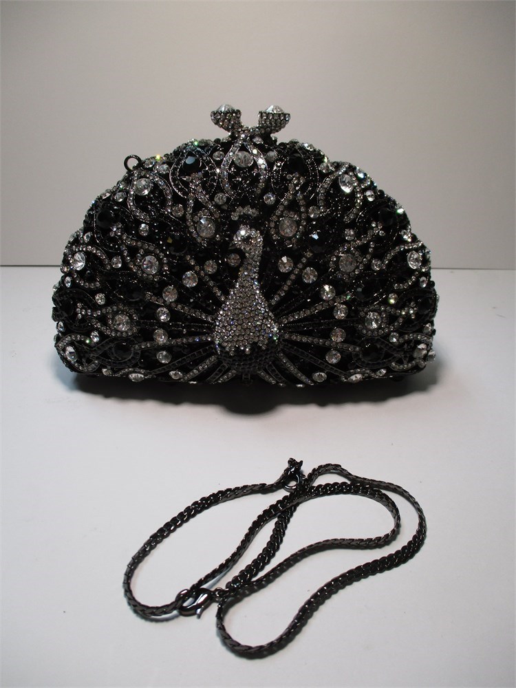 Peacock Rhinestone, Hemitite-Tone, Metal Frame Clutch w/ Chain