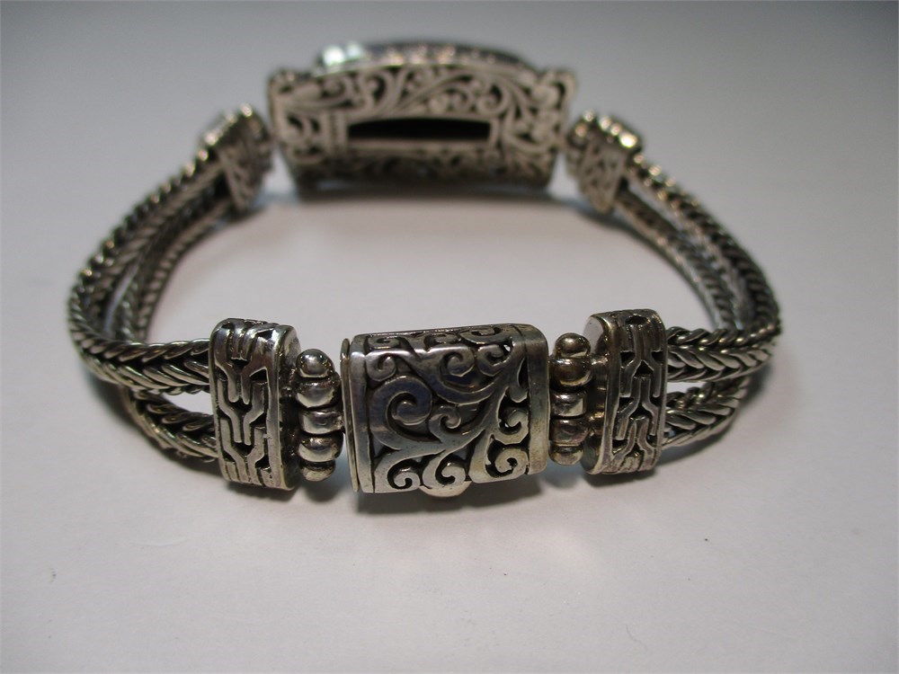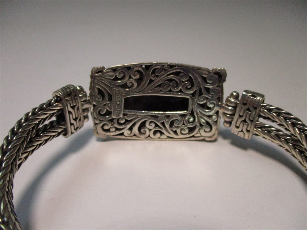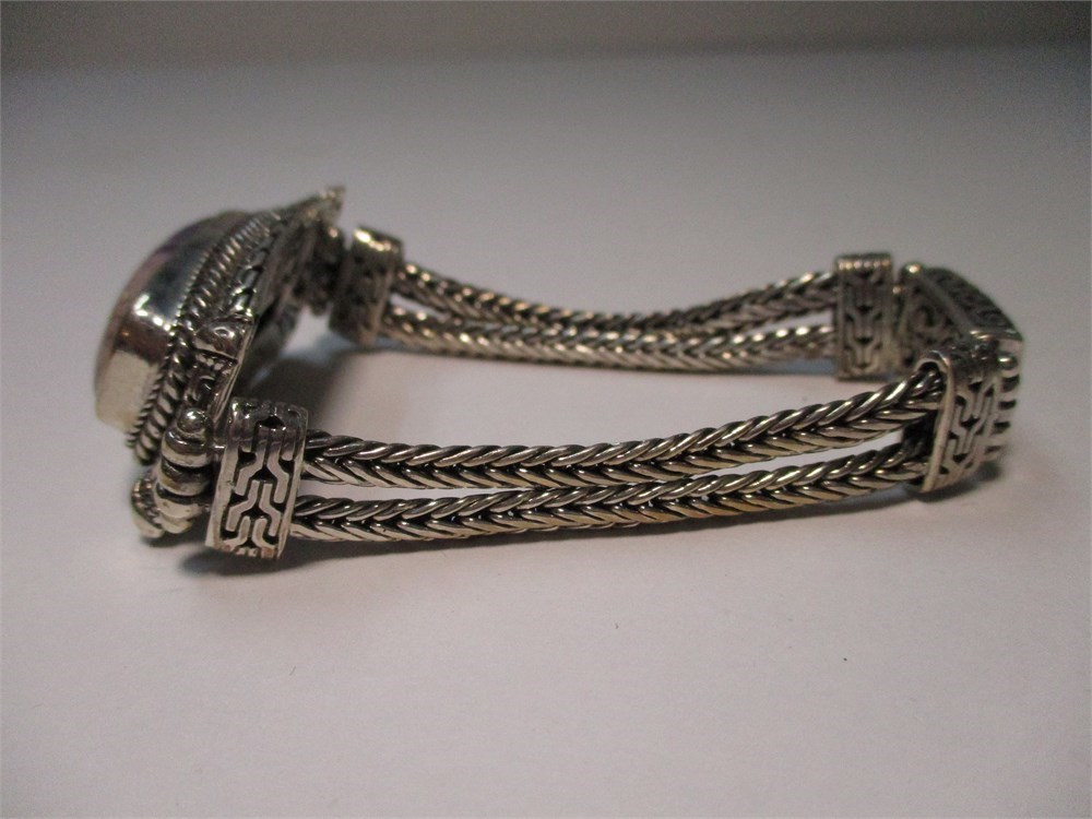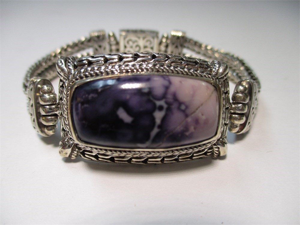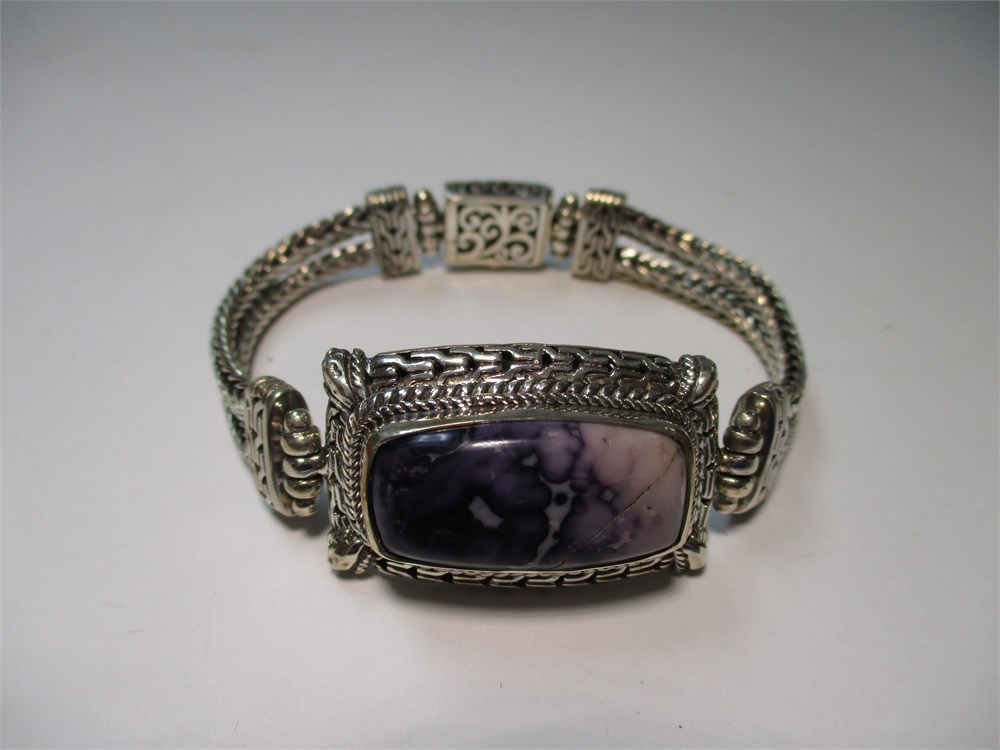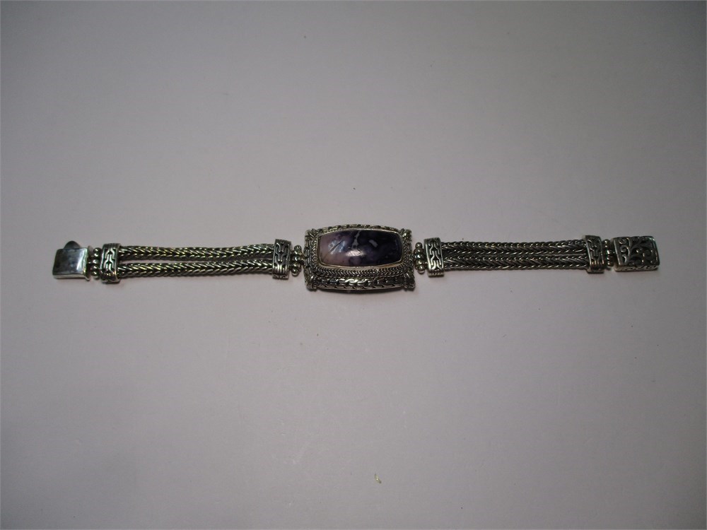 A Beautiful Artisan Crafted from Bali, Sterling Silver and Charoite Bracelet. This Bracelet has awesome detail and craftmanship. The large rectangular Charoite stone sits front and center in a nice high bezel.  It measures 7" in length and fits comfortably on the wrist.  A lovely and fashionable piece ! Hallmarked Sarda 925.
