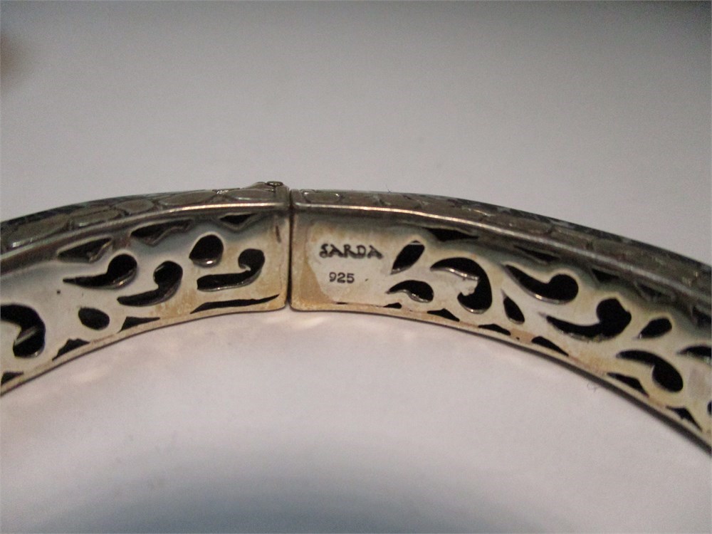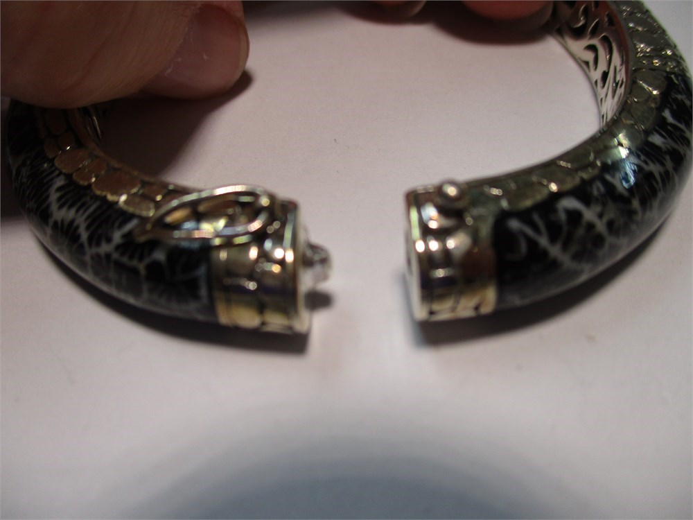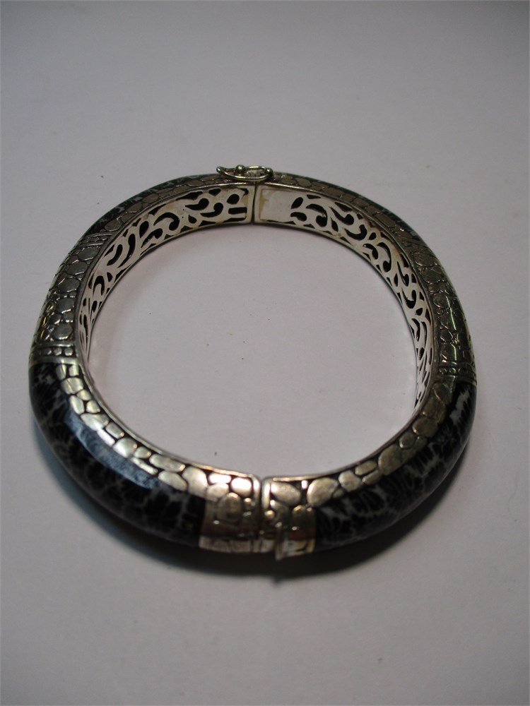 A Beautiful Balinese Artisan Crafted, Ornate, Sterling Silver a Patterned Enamel Oval Hinged Bangle Bracelet featuring alternating segments of beautiful highly textured metalwork and black and white patterned enamel.  It has an inside diameter measurement of 2.38".  The oval design makes this extremely comfortable.  Great designer piece ! Hallmarked Sarda 925.