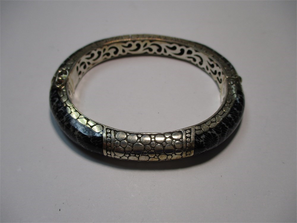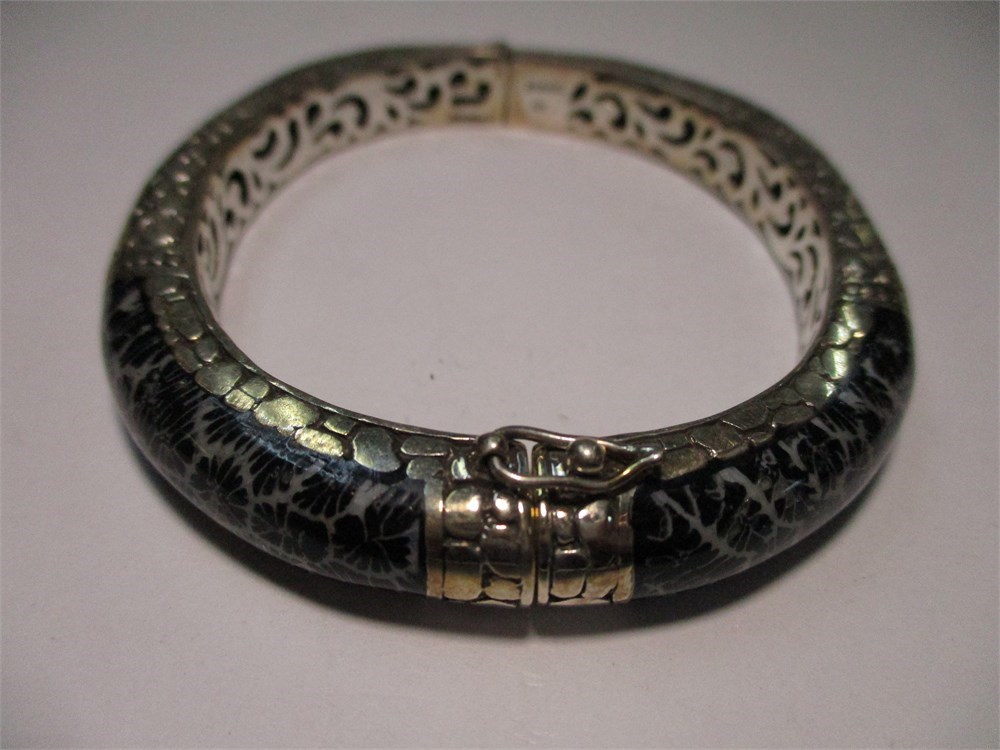 Ornate, Balinese, Sterling Silver and Patterned Enamel Oval Hinged Bangle