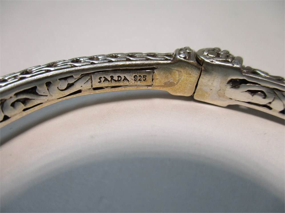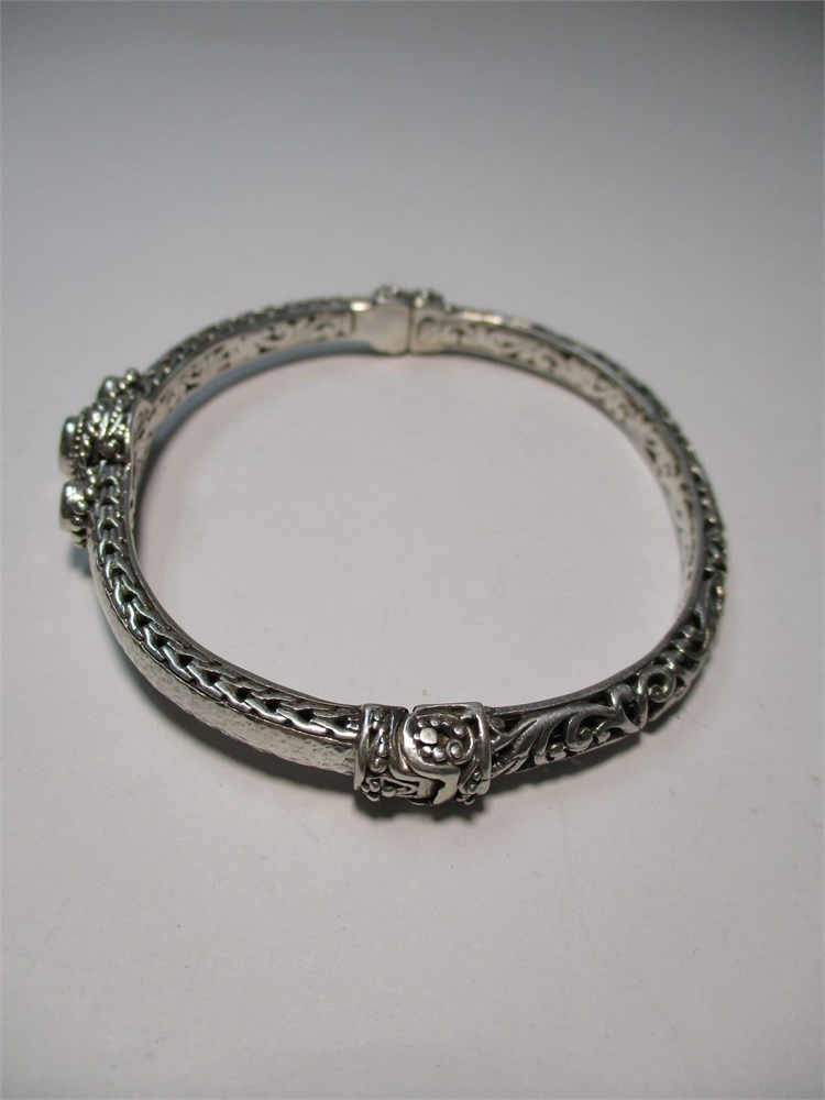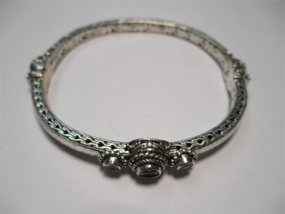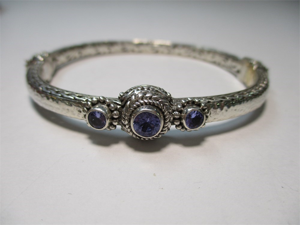 A Beautiful Balinese Artisan Crafted, Ornate, Sterling Silver and 3 Round Faceted Tanzanite Stones Bracelet. A lovely combination of a hammered finish and scrolling detail.  It has a magnetic closure which makes it very secure with a 2.25" inside diameter.  A lovely yet simple piece.  Hallmarked Sarda 925.