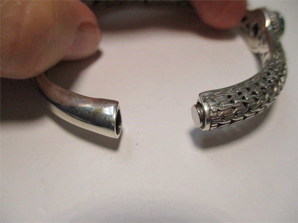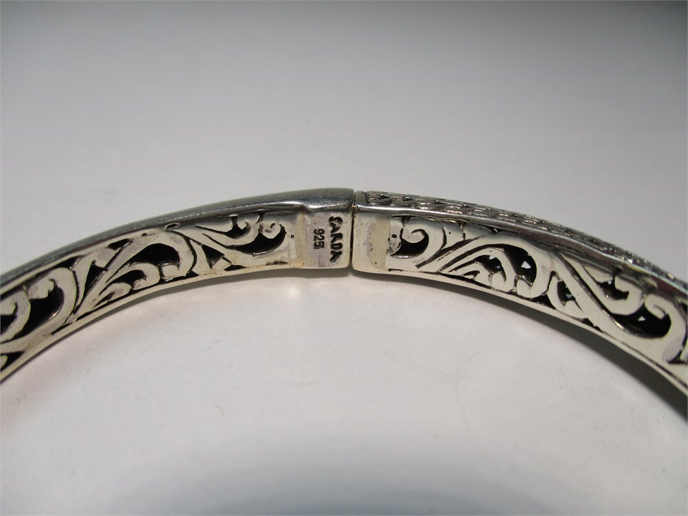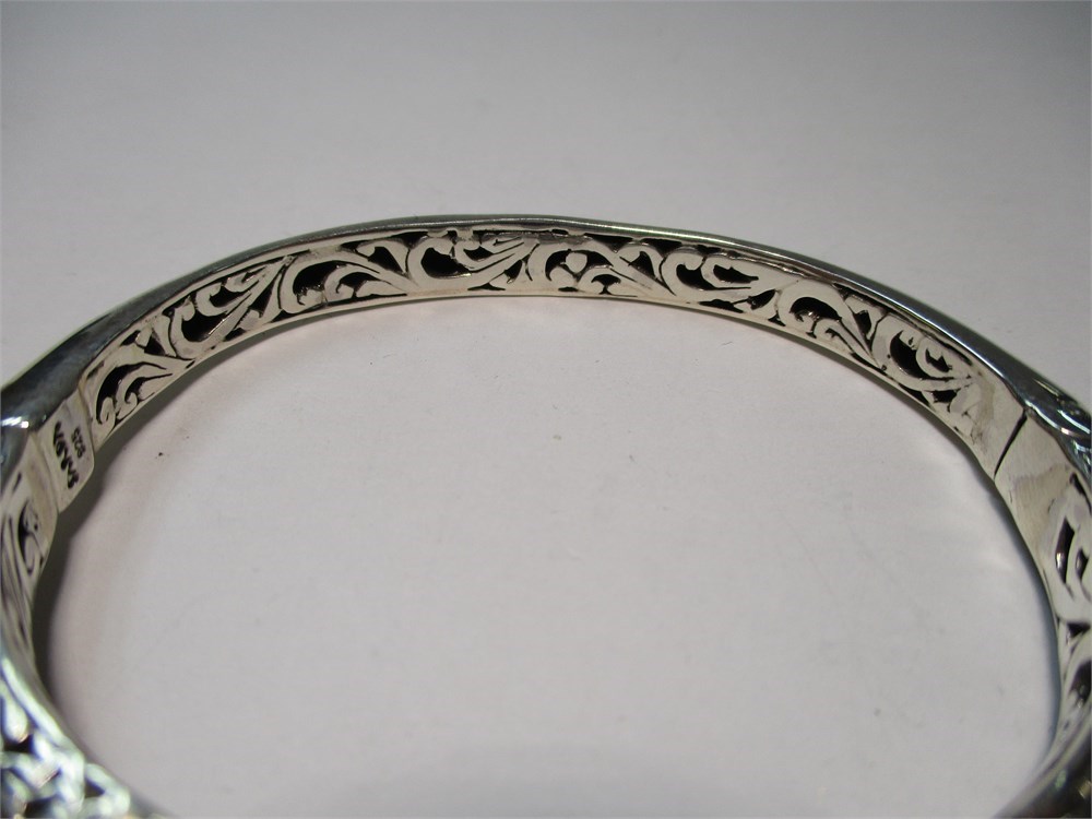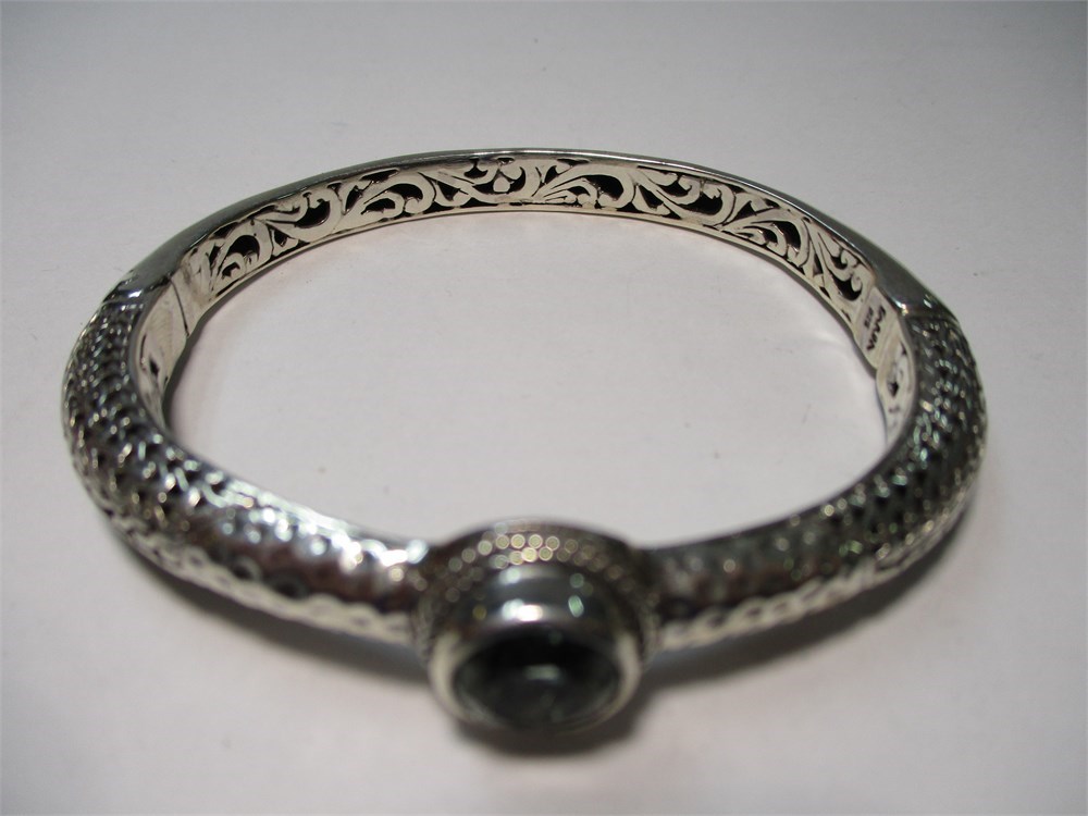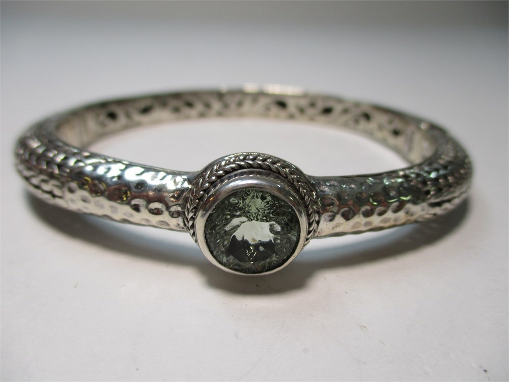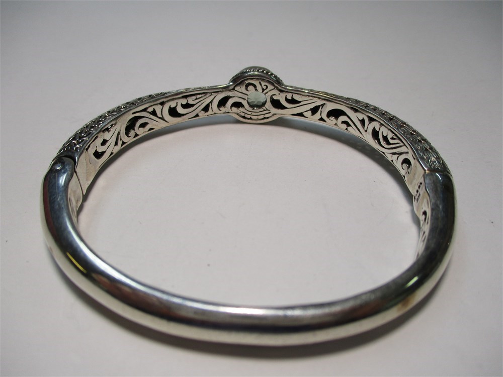 A Beautiful Balinese Artisan Crafted, Ornate, Oval, Sterling Silver & Round Faceted Prasiolite Hinged Cuff Bracelet. It has a lovely combination of smooth, hammered, and filigree.  It has a push button to open and a magnetic closure for a security. It has an inside diameter of 2.38".  A beautiful and simple piece !  Hallmarked Sarda 925.