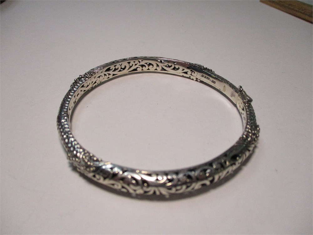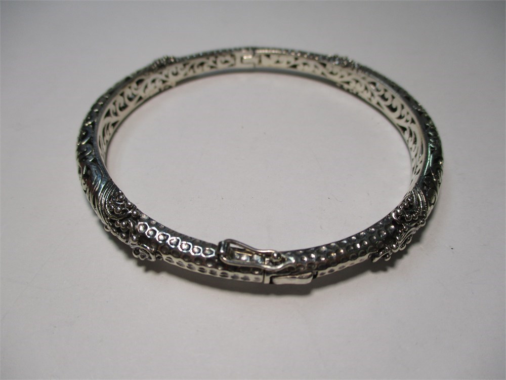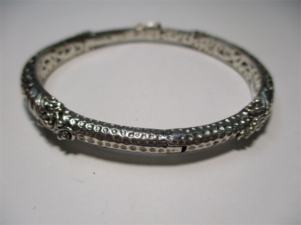 A Beautiful Balinese Artisan Crafted, Ornate, Hinged Bangle Bracelet.  A lovely combination of hammered finish and scrolling filigree detail.  It has a push button to open with a figure eight safety catch for added protection.  It has an inside diameter of 2.38".  Hallmarked Sarda 925.