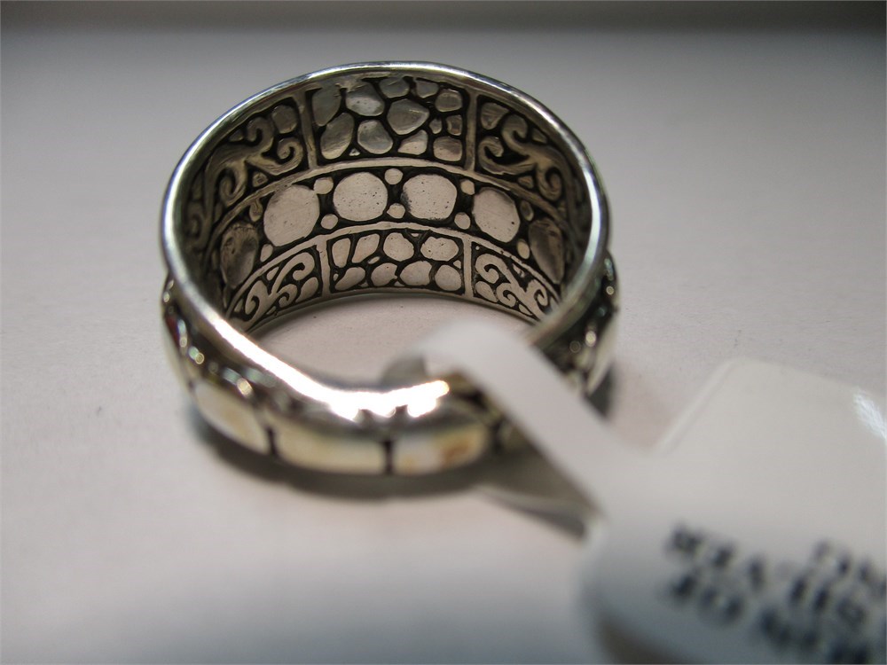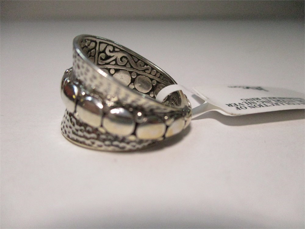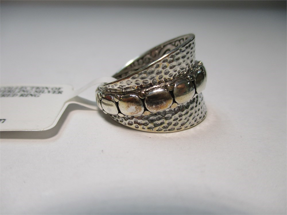 This is a lovely Artisan Crafted Balinese, Sterling Silver Band Ring.  A lovely hammered finish on the outside with a high shine polished center and lovely filigree work on the band interior.  Fits a size 7.