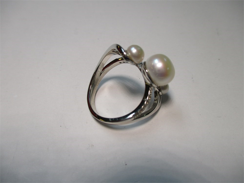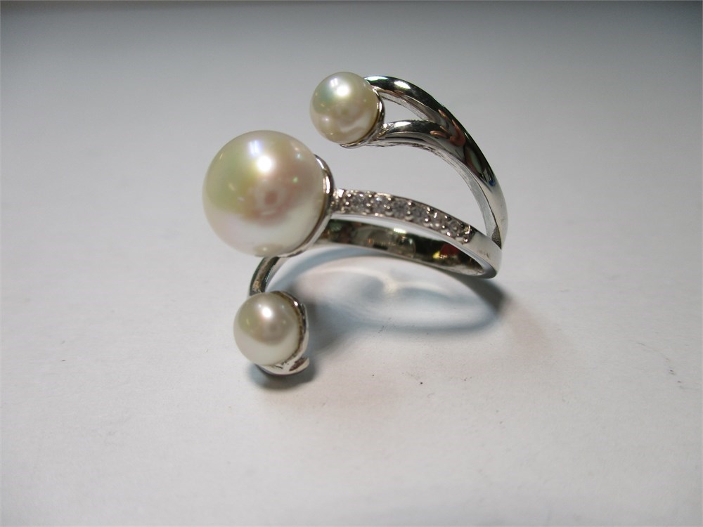 This is a lovely high polished Sterling Silver and Faux Pearl & CZ Cocktail Ring. A lovely, classic ring that will fit a size 7. Made in China.