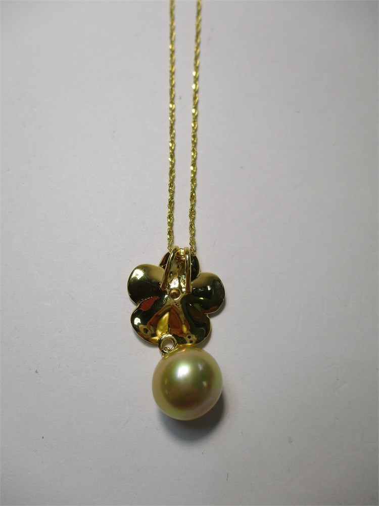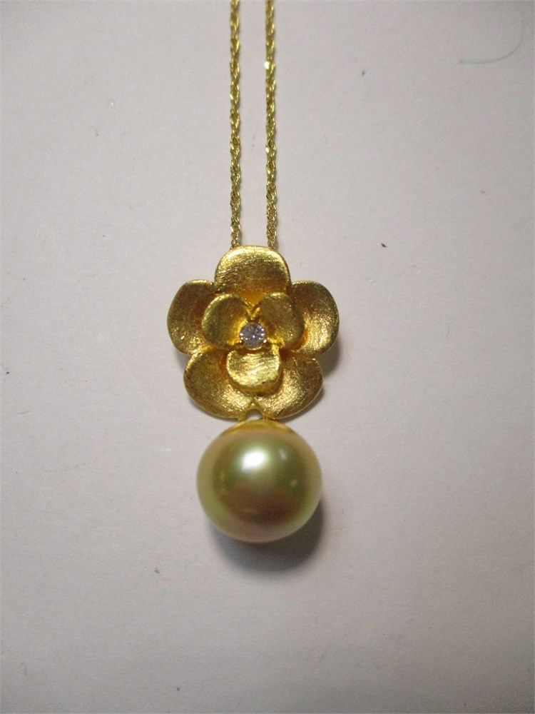 This is a lovely 11-12MM South Sea Cultured Pearl & White Zirconium 18k over Sterling Flower Necklace.  A beautiful matte finish flower with a white zirconium in the center and from it suspends a large 11-12 MM creamy south sea cultured pearl. All that suspends from a 18" diamond cut rope chain with a lobster claw clasp and an additional 2" extension to accommodate various necklines.  Beautiful piece !
